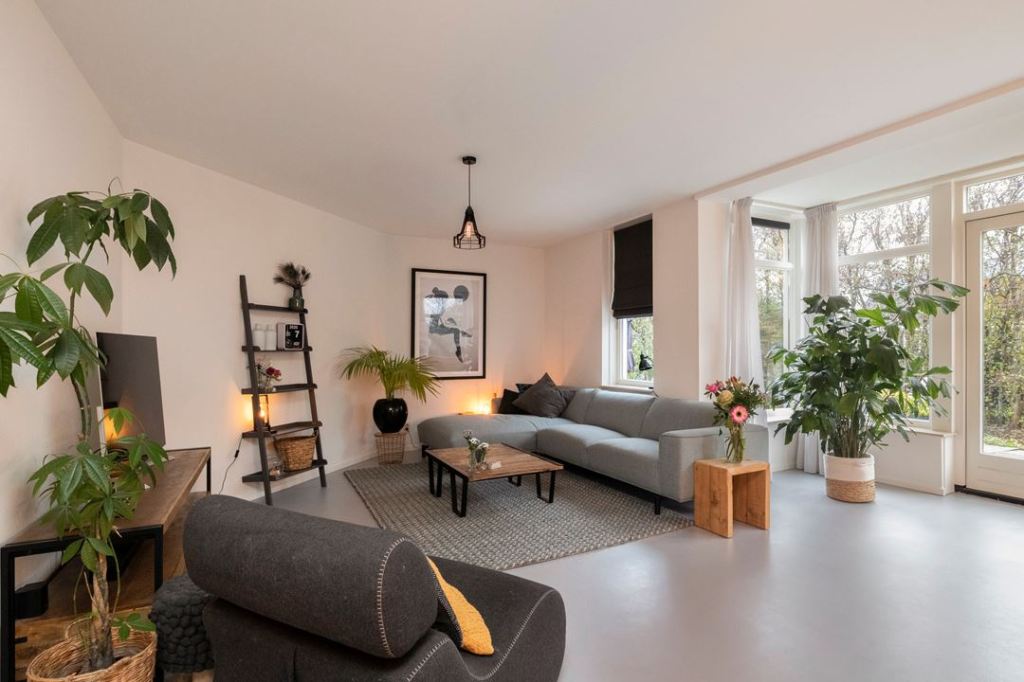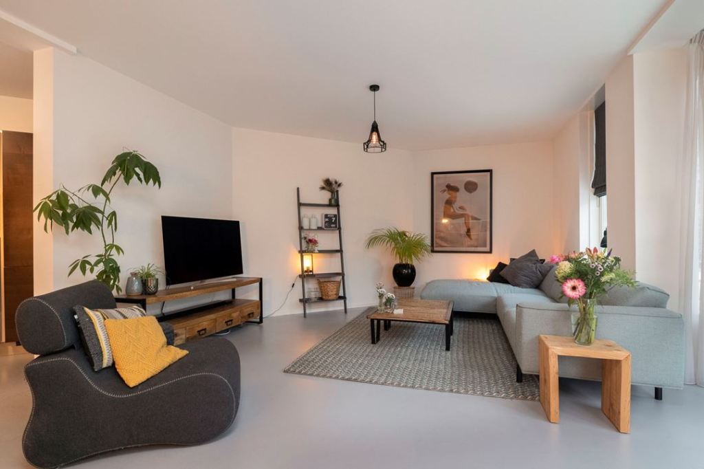 Salon jest bardzo przestronny, urządzony w jasnych barwach. Skromna półka pod tv i drabinka robiąca za regał+ dwa proste stoliki. Bardzo podoba mi się fotel i to, że znajdują tam się duże rośliny doniczkowe 🌿😀