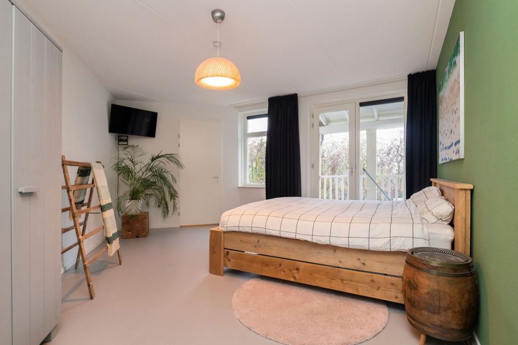 Sypialnie także skromnie urządzone. Nie ma ogromnych szaf i niepotrzebnych bibelotów. Gdybym miała wybrać jedną, to podoba mi się zdecydowanie ta pierwsza 😊 Dlaczego? Bo stoi tam wielka palma, drabinka drewniana robi za wieszak a zamiast typowego nocnego stolika- mamy beczkę!