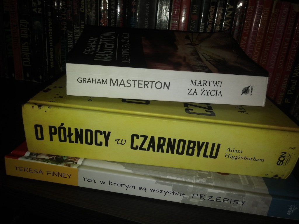 Pierwsza książka, to thriller Grahama Mastertona, którego uwielbiam, pt „Martwi za życia”. Jest to kolejna część serii, której główną bohaterką jest nadkomisarz Katie Maguire. Sprawa dzieje się w Irlandii. Policjanci walczą z gangami narkotykowymi i w dodatku to nie koniec kłopotów… Zaczynają znikać ludzie. Trafiają oni do kliniki, gdzie są bestialsko okaleczani. Dlaczego? Śledztwo się rozpoczyna… Książka świetnie napisana i trzymająca w napięciu. Czytając jakąś pozycję Mastertona, zawsze się zastanawiam skąd ten facet bierze pomysły 😊😛