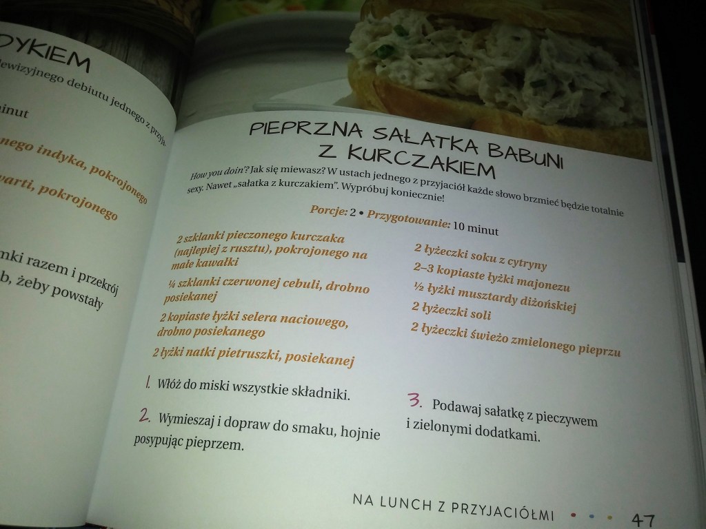 Ostatnia książka, to taka niespodzianka 😛 Dostałam ją w prezencie i wcześniej jej nigdy nie widziałam. Serial „Przyjaciele” oglądałam. Teraz w ogóle seriali nie oglądam. Ostatnim był 5-odcinkowy „Czarnobyl”. Wolę czytać 😊 Autorka książki, Teresa Finney jest wielką fanką tego kultowego serialu. „Przyjaciele” byli częścią jej codzienności. Uwielbiała to, że tak ważne było tam jedzenie. Dlatego napisała tę książkę, która zawiera ok 100 przepisów inspirowane serialem. Jest tu np sprawdzony przepis na pieczonego indyka i kanapkę z tego, co zostało, margarita Rossa, truskawkowy dżem Moniki, sandwicze Joeya i wiele innych. Większość przepisów nazwana jest „po serialowemu” a każdy z nich opatrzony jest zdjęciem 📷 I co fajne, można podejrzeć i spróbować zrobić dania, które jedzą Amerykanie 😛