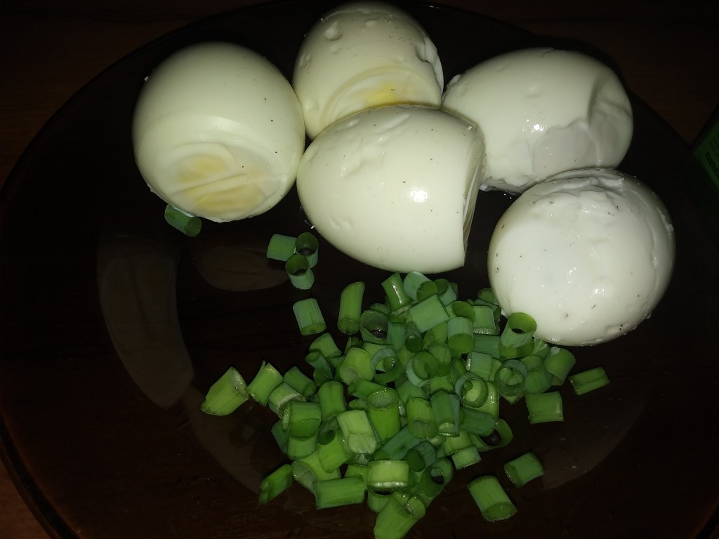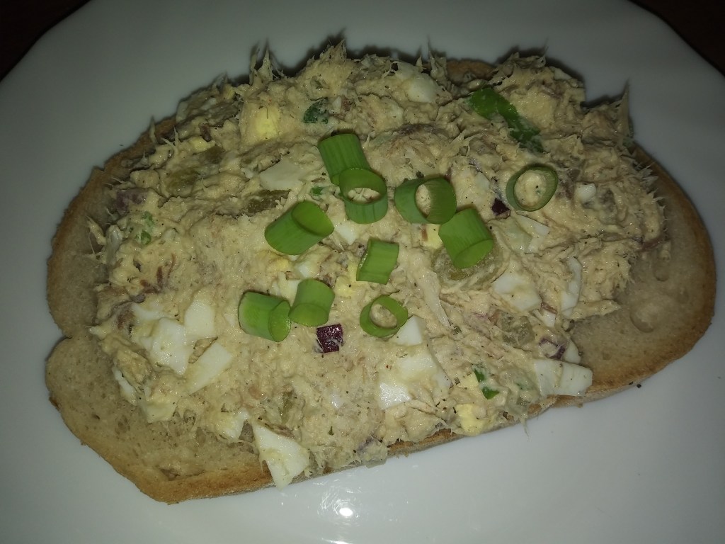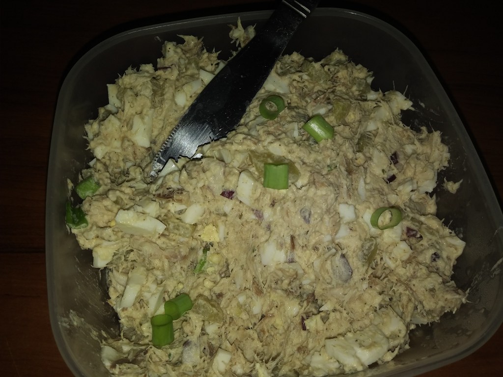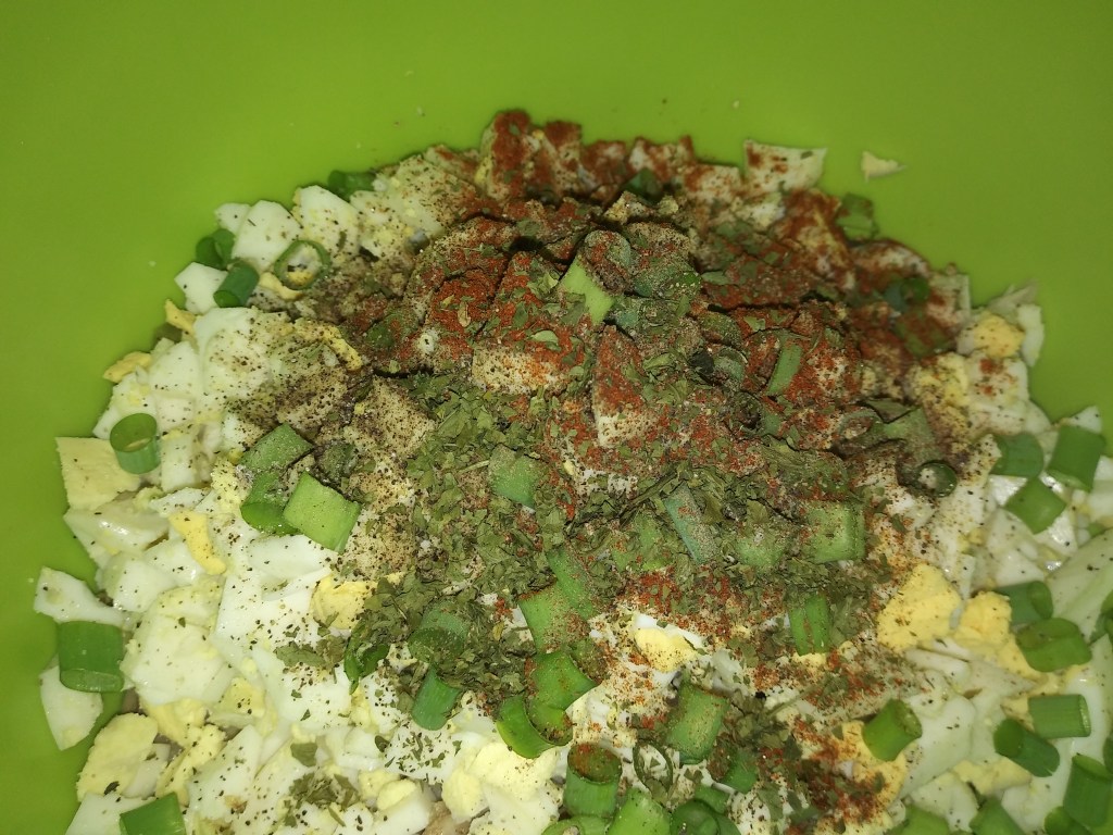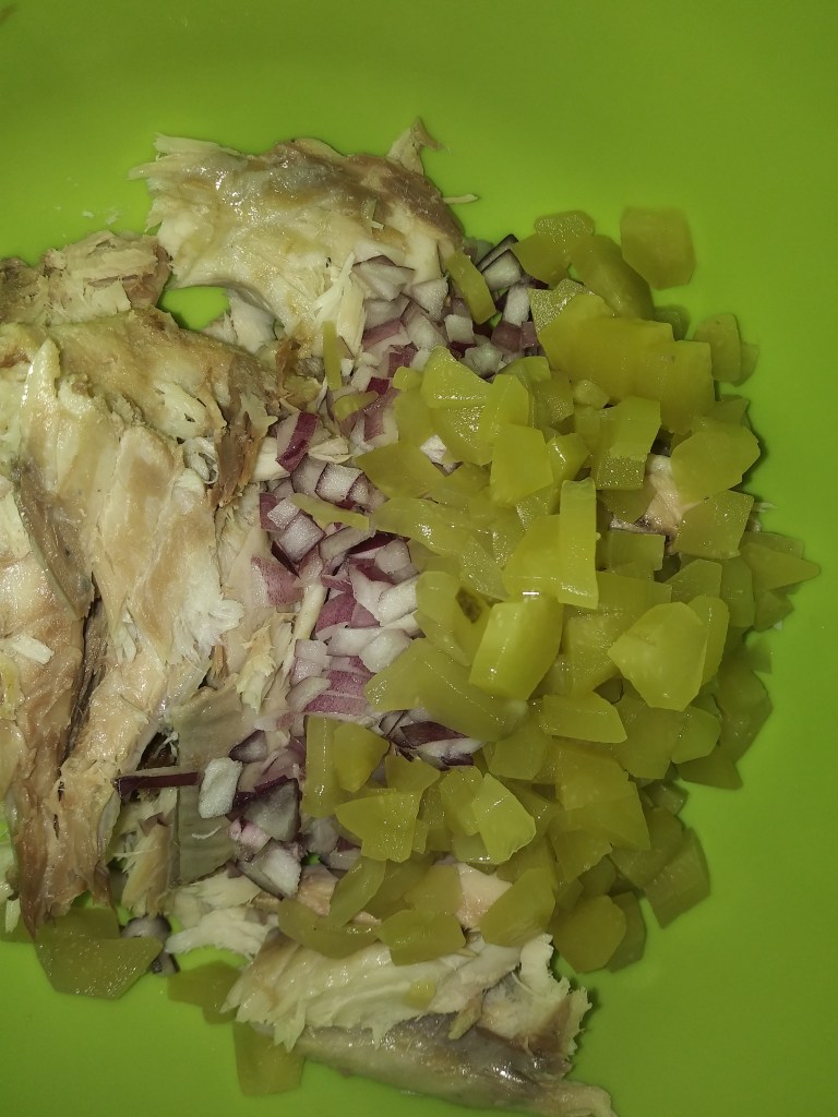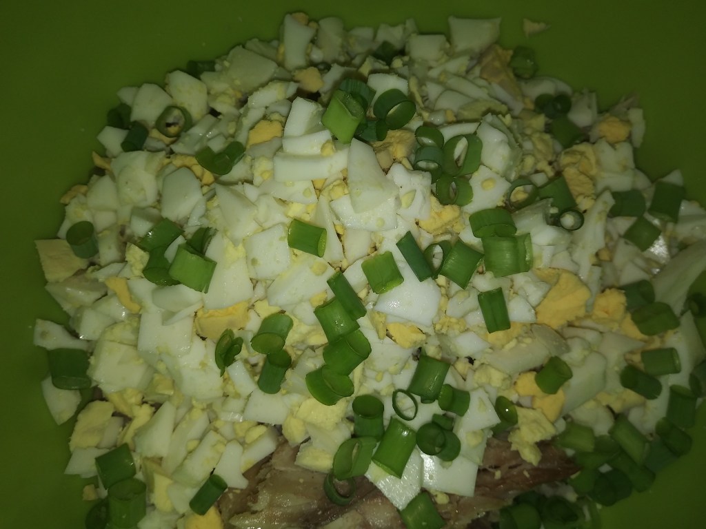 Makrele obieramy ze skóry i usuwamy ości. Wrzucamy do miski w kawałkach. Jajka ugotowane na twardo, kroimy w drobną kostkę. Ogórki i cebulę obieramy ze skórki i też kroimy w kostkę. Wrzucamy do ryby. Dodajemy posiekany szczypiorek, 2 łyżeczki musztardy i 2 łyżki majonezu. Do tego pieprz czarny, paprykę ostrą w proszku, trochę soli i suszoną natkę pietruszki. Wszystko mieszamy i do lodówki 🙂