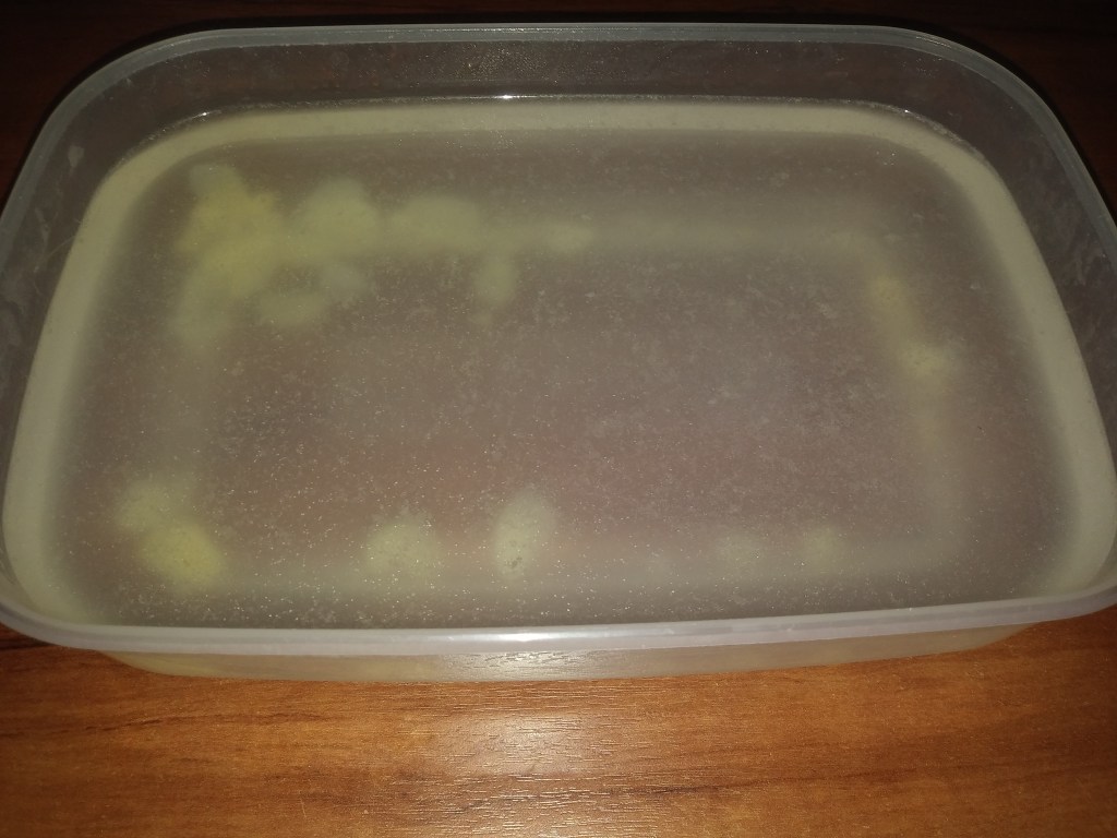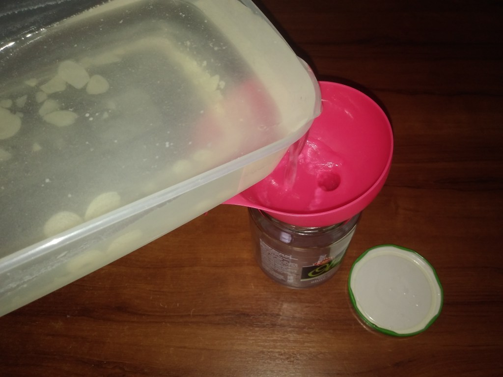 Do plastikowego pojemnika wrzuciłam dwie kostki i trochę płatków czosnkowych. Zalałam to wrzącą wodą i czekałam, aż ostygnie. Potem przelałam wywar do słoika. Odstawić to trzeba na dobę. Ogólnie nie może stać dłużej niż dwa dni.
