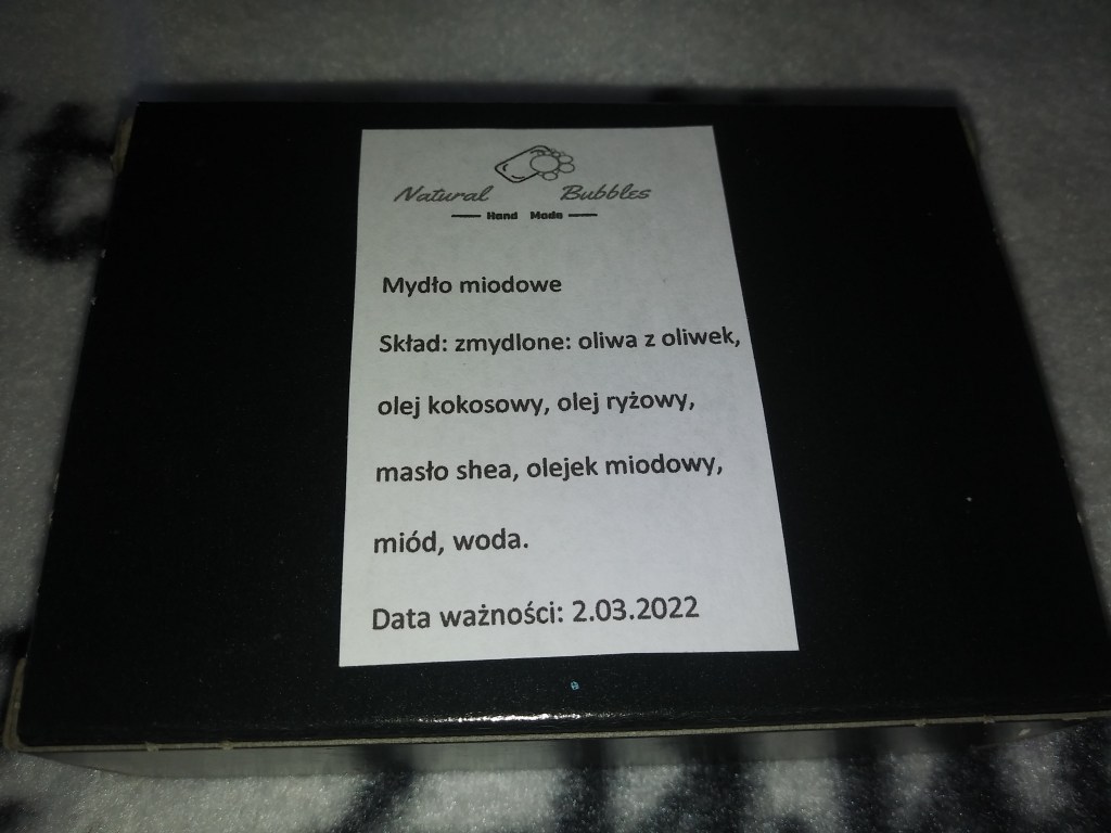 Oprócz mydeł, w pudełku była też ulotka reklamowa, a także trzykartkowy spis dostępnych produktów, np kokosowe mydło peelingujące, pokrzywowe mydło do ciała i włosów, mydło z węglem aktywnym czy tymiankowe mydło antybakteryjne 🙂 Natural Bubbles produkuje także świece.
