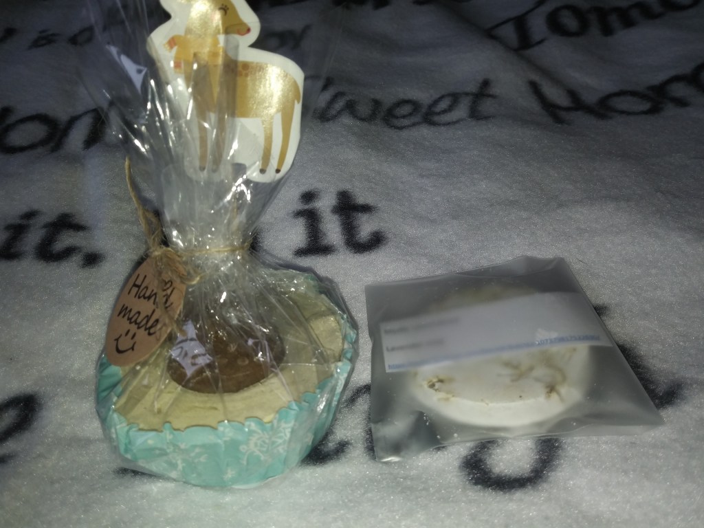 Na odwrocie opakowań opisany jest skład kostek i podana data ważności. A owe gratisy, to okrągłe, lawendowe mydełko wyglądające, jak musująca tabletka do kąpieli i bożonarodzeniowa babeczka o zapachu dyni 🎃 z reniferem. Jest już po dacie ważności, ale sądzę że skórze nie zaszkodzi. Może też służyć jako ozdoba łazienki.