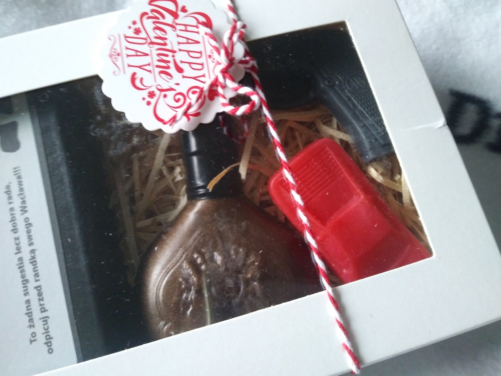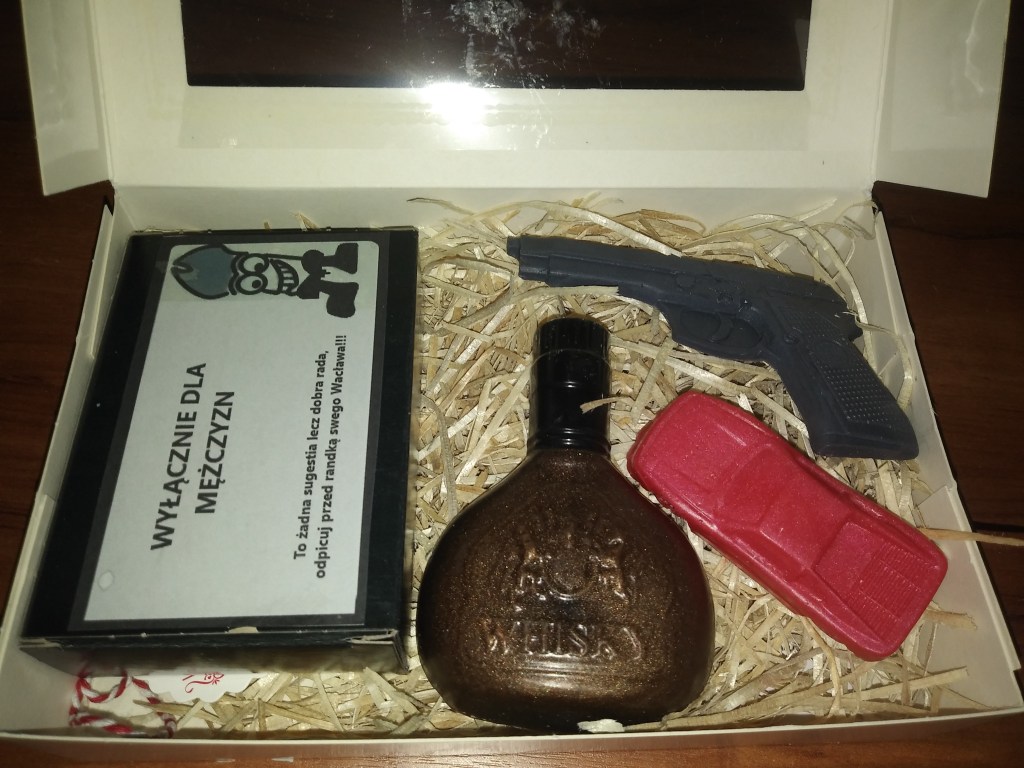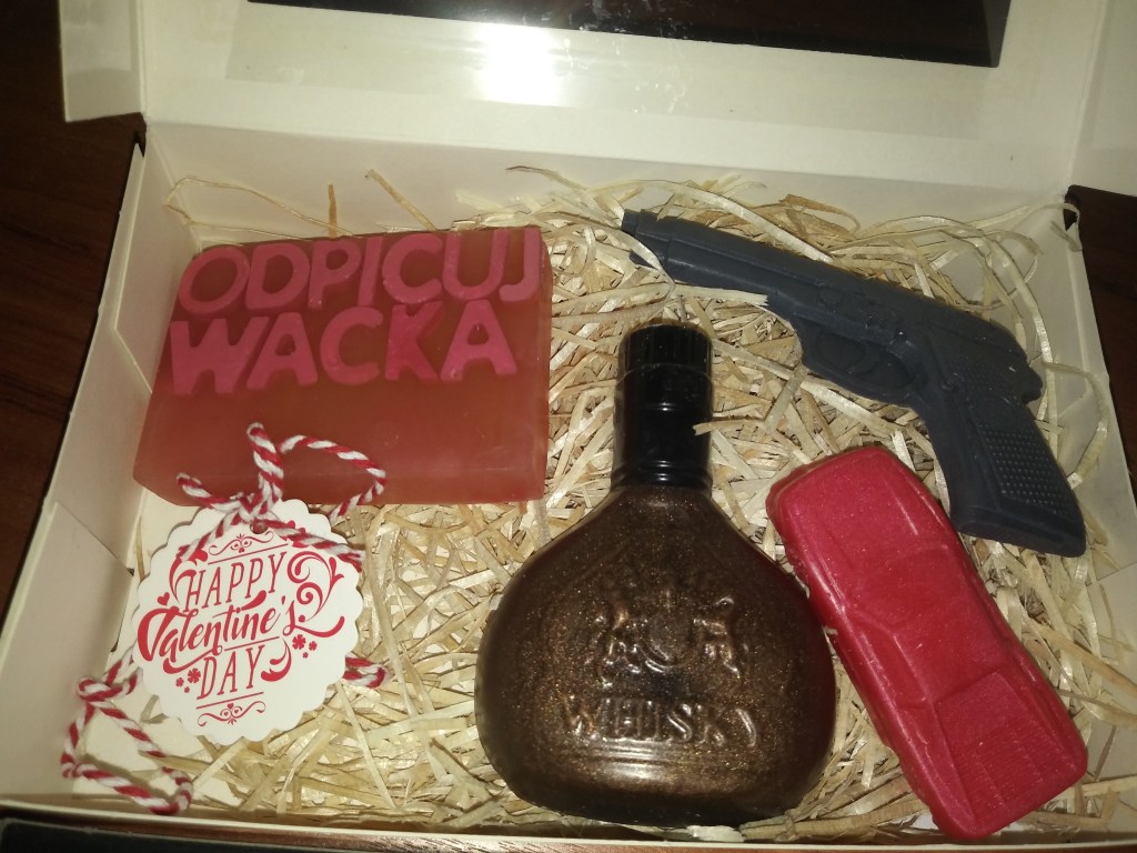 Co wchodzi w skład męskiego zestawu? Cztery mydełka o różnych kształtach i zapachach. Jest tam mini auto, pistolet i butelka whisky 🙂 Do tego kostka mydła z napisem „odpicuj wacka” specjalnie do TEJ części ciała 😅