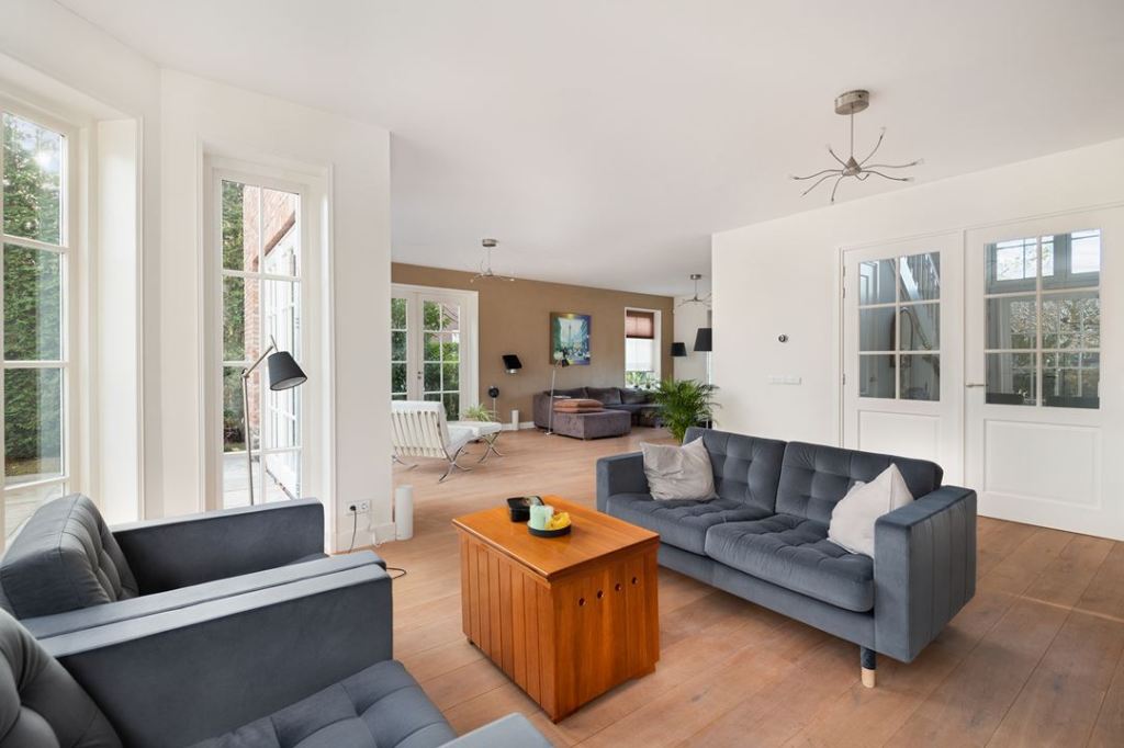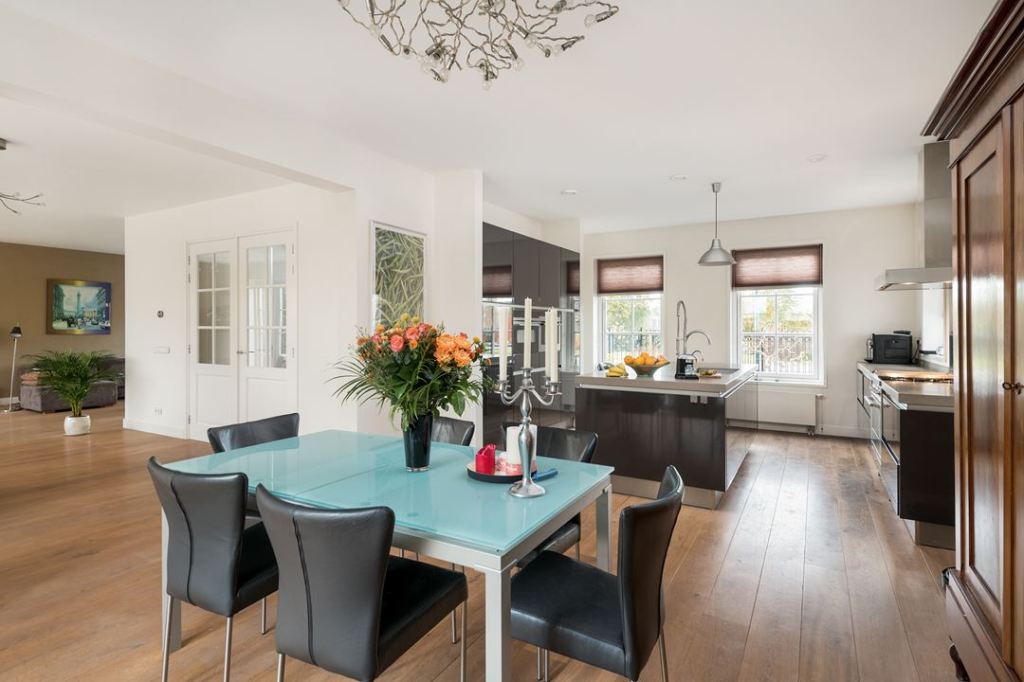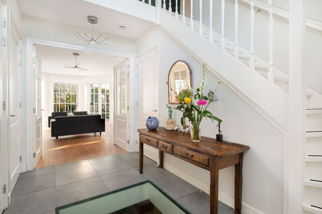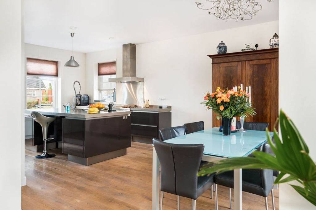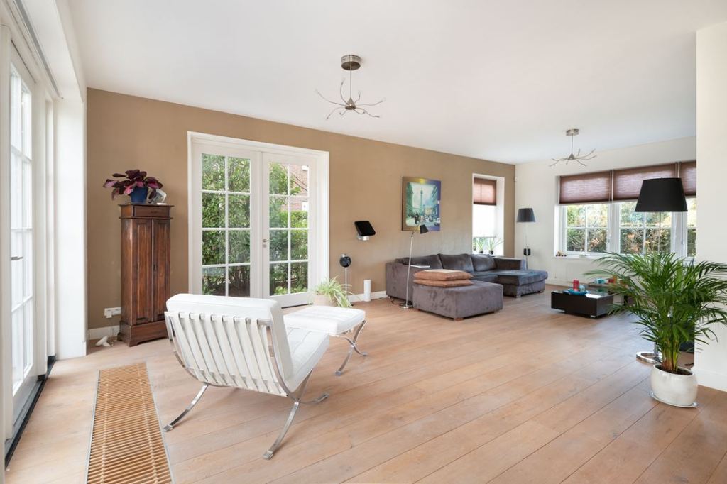 Duży dom, przestronne wnętrza w jasnych kolorach. Dominuje nowoczesność, ale i jest kilka drewnianych mebli.