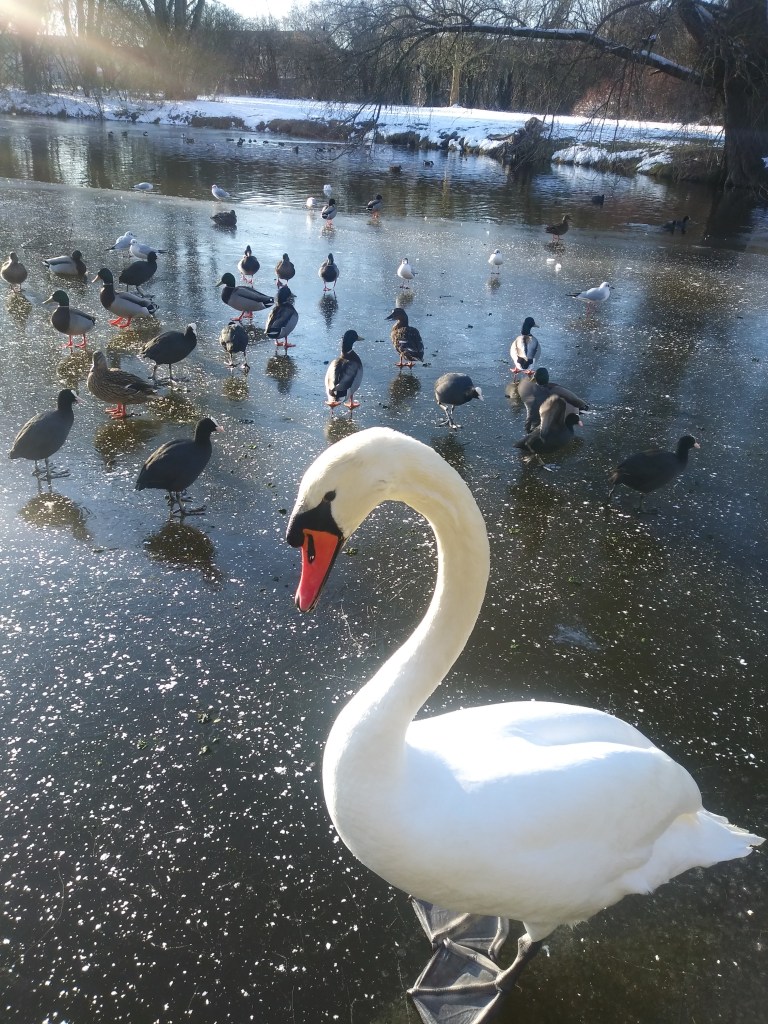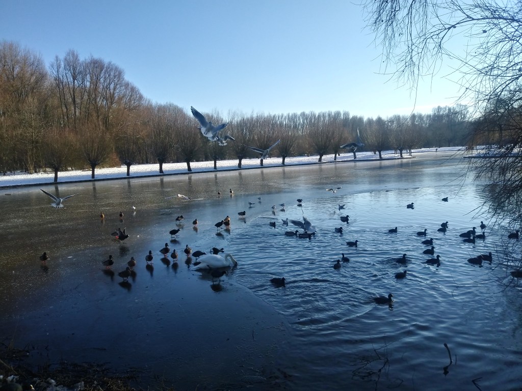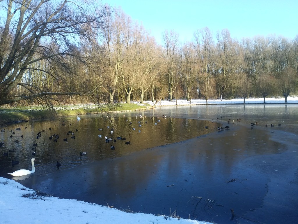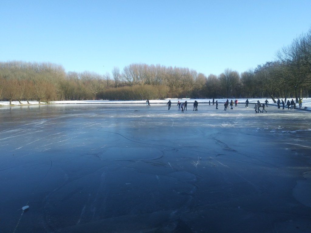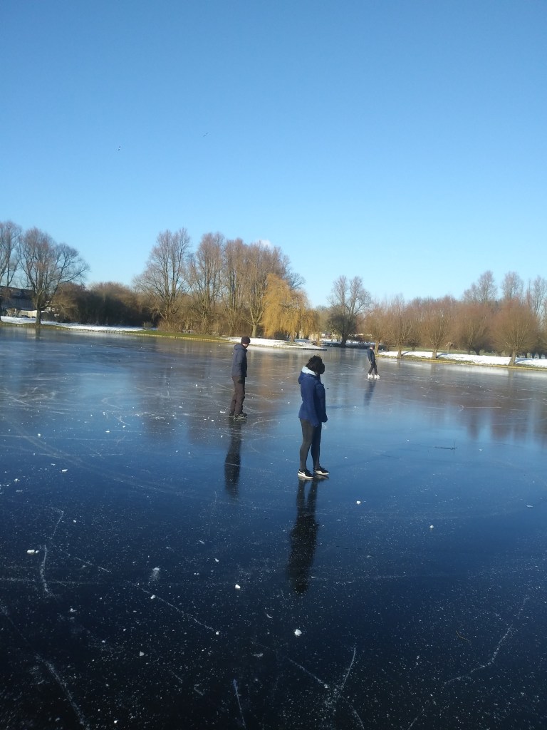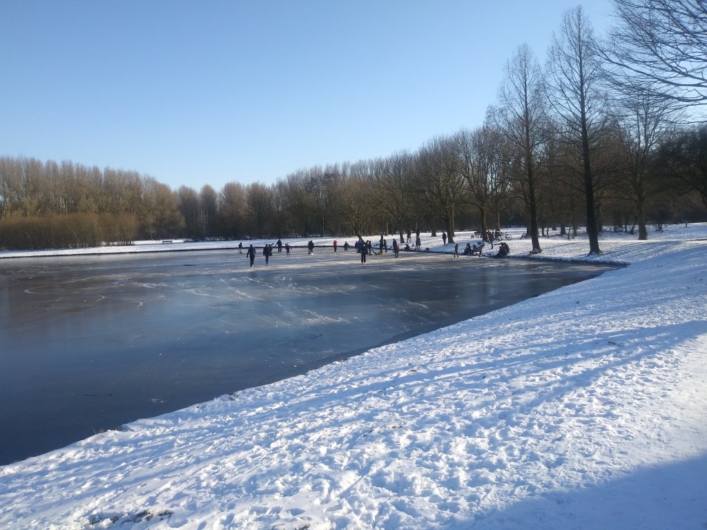 Widziałam w internetach filmik z Amsterdamu, gdzie ludzie (dorośli) tańczą na ulicy, ciesząc się ze śniegu 🙂 Obok domów stoją bałwany ⛄ Jest na tyle mroźno, że woda w kanałach zamarza. Sportem zimowym Holendrów jest jazda na łyżwach- oni to kochają. Woda skuta lodem, to znak, że trzeba wywlec sprzęt i ruszyć pojeździć. Dzisiaj widziałam dwie dziewczyny, które spacerowaly po kanale. Myślę sobie: idziemy do parku sprawdzić, czy porządnie zamarzło jeziorko i przy okazji nakarmić ptaki, co bardzo lubię 😊 No i poszliśmy. A tam jazda figurowa trwa w najlepsze: rodzice z dziećmi na lodowisku, inni przynieśli stołki i termosy, siedzieli na brzegu i patrzyli na zabawę 🙂