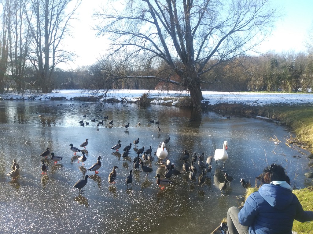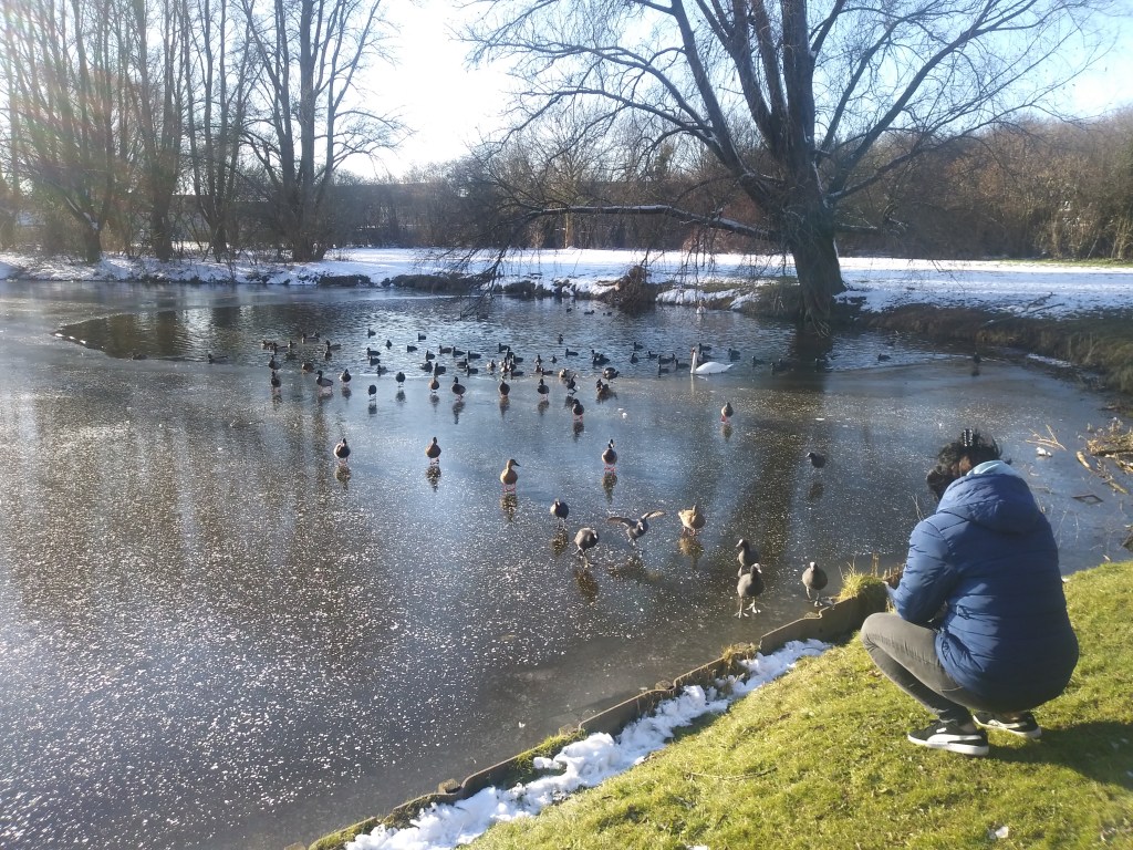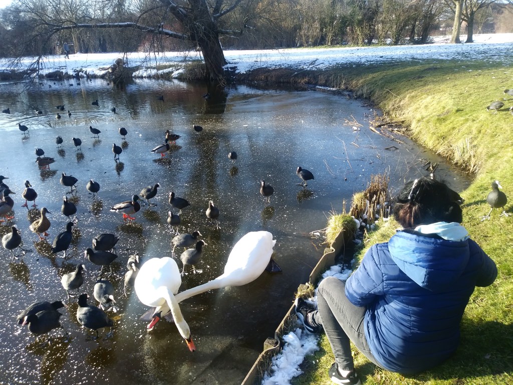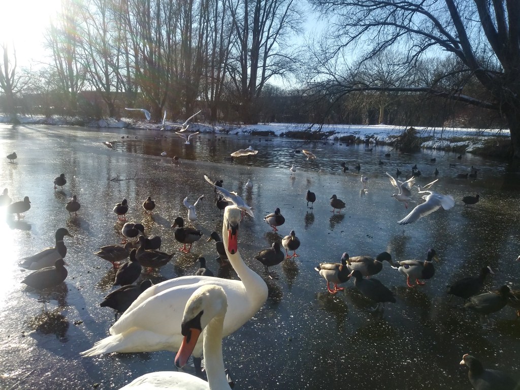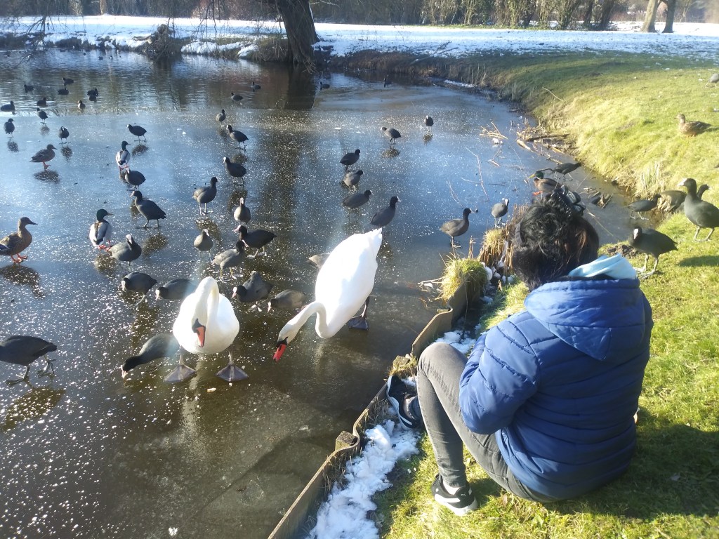 Karmilismy też ptaki. W jednej części jeziorka woda nie była zamarznięta i tam znaleźliśmy łabędzie, kaczki i perkozy. Gdy tylko podeszliśmy do brzegu, te biedne głodne ptaki niemal biegiem do nas szły. Nie bały się podchodzić blisko. Przyleciały nawet mewy.