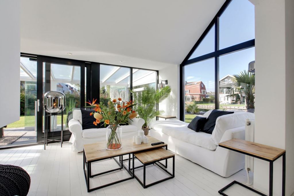 Dom położony jest nad kanałem. Na zewnątrz i w środku dominuje biel. Ale oprócz tego koloru, ma mnóstwo dodatków w kolorze czarnym, co czyni wnętrze bardzo ciekawym i luksusowym.