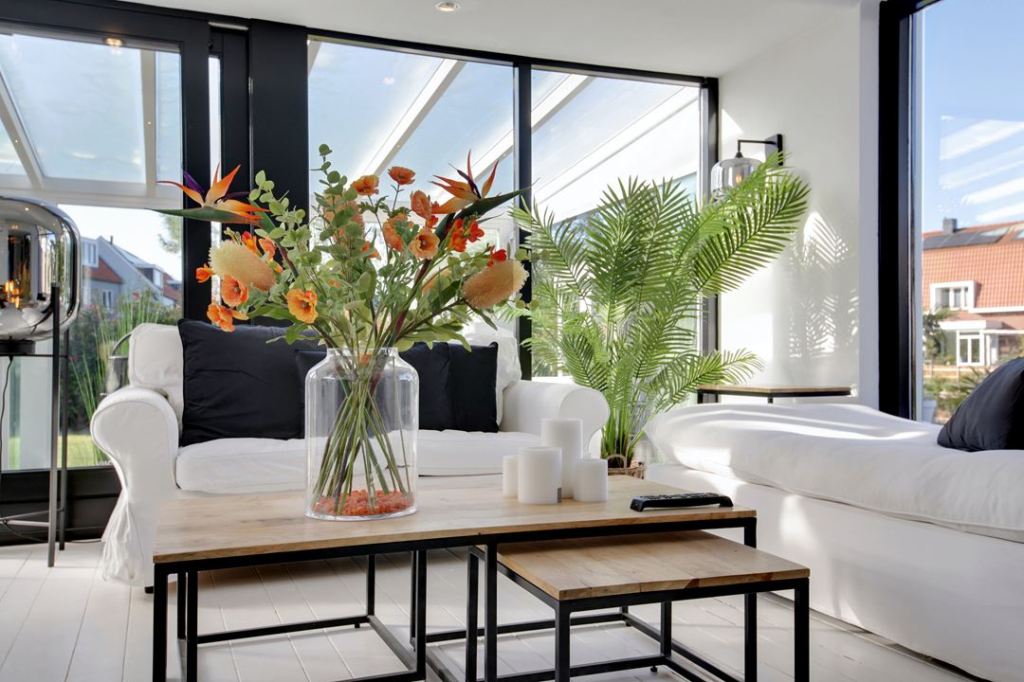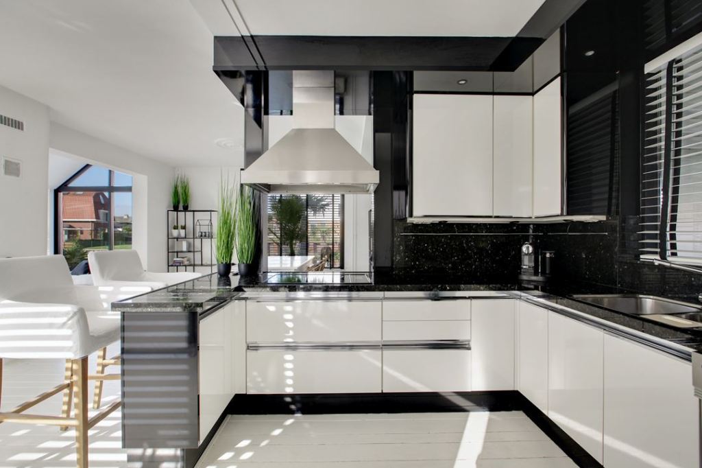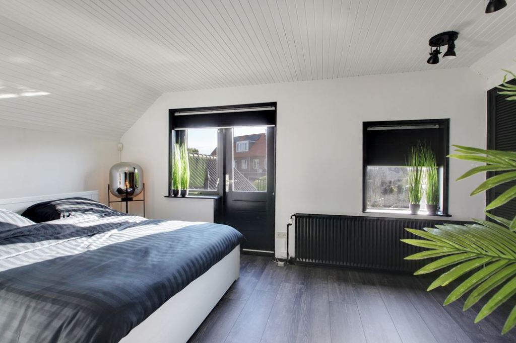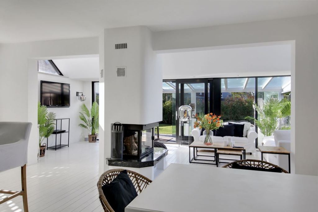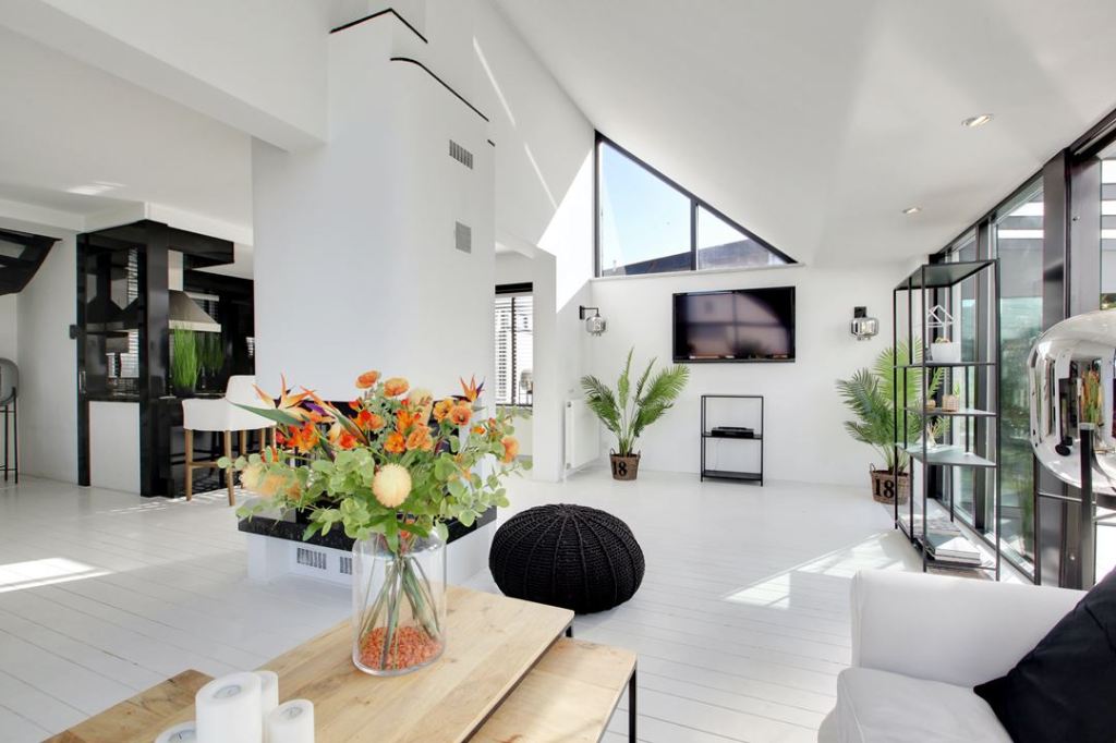 W tym przypadku, nie jest to typowo wielkomiejski loft, a wolnostojący dom. Nie widać w nim metalowych rur, czy gołego muru, albo cegły. Jest mnóstwo błyszczącej bieli i płytek. Kuchnia jest bardzo nowoczesna, w salonie na środku stoi kominek. Oprócz tego, znajduje się tam sporo zielonych roślin (dominują palmy 🌴) a w jednej sypialni są nawet krokwie na suficie 🙂 No i oczywiście biel połączona z czernią 😊⚪⚫⬜⬛