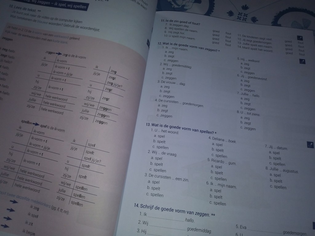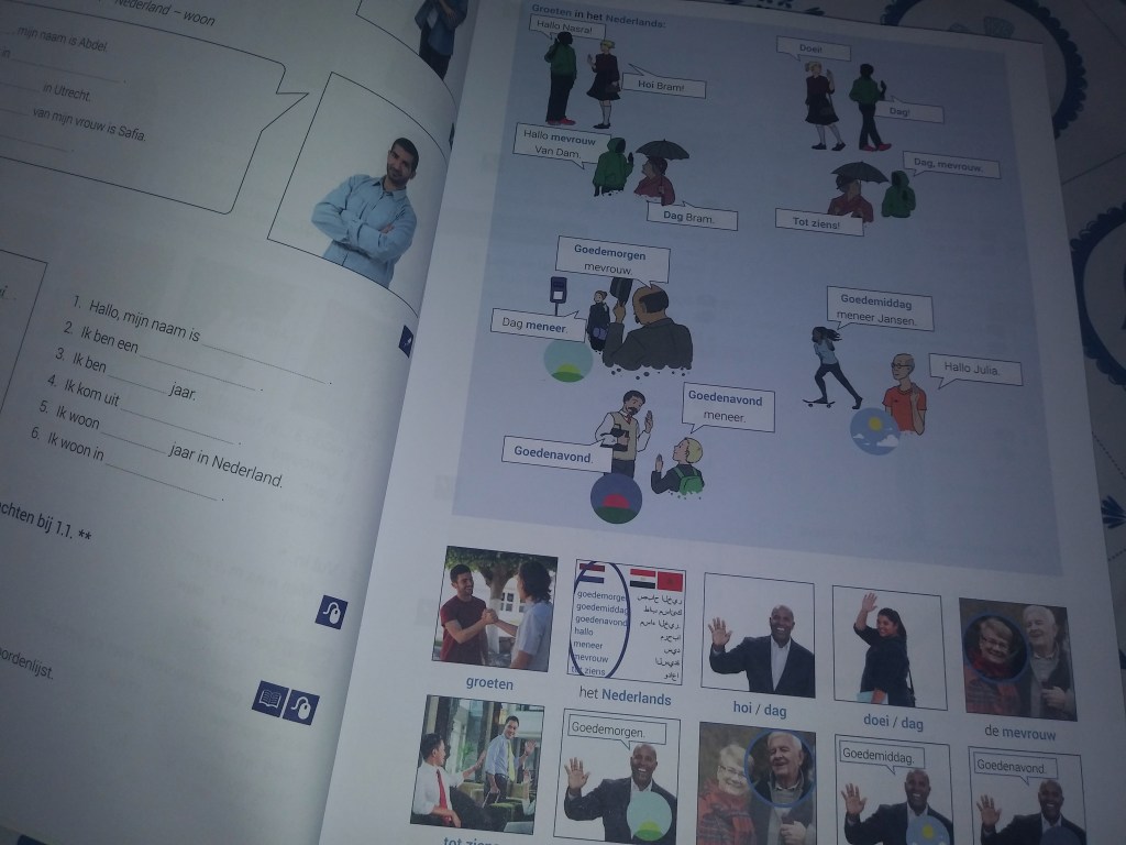 Więc wpisaliśmy się się na listę chętnych podając swoje numery telefonów 📱Pewnego wieczora, odebrałam telefon od nauczycielki Margot, czyli Małgosi (która ma męża Holendra). Odpowiedziałam na kilka pytań odnośnie mojej znajomości języka. Potem dowiedziałam się, że lekcje będą odbywały się w każdy piątek (miałam nadzieję, że w poniedziałek), przez 3 godziny, od 15:00 do 18:00 😳 No cóż… Jak się powiedziało A… Klamka zapadła. W zeszły piątek, trochę zmęczeni po pracy (nasza grupa skończyła pracę ciut wcześniej) poszliśmy na górę w firmie i poznaliśmy się z Małgosia. Sympatyczna kobitka wyjaśniła nam, że zaczniemy naukę od podstaw, żeby te dwie nowe osoby w Holandii nie były w tyle. Mnie to absolutnie nie przeszkadza, bo wiele rzeczy, których wcześniej się sama uczyłam mi się przypomni. Bo nie oszukujmy się, niektóre słówka zapomniałam 😒 Na pierwszej lekcji, zapoznalismy się z etapami nauki, paroma regułkami i zaczęliśmy się przedstawiać i opowiadać o sobie po holendersku. I sporo rzeczy mi się przypomniało. Dostaliśmy też po książce, notatniku i dlugopisie 📓📖 Trzy godziny minęły bardzo szybko, bo rozmawialiśmy też o życiu w tym kraju, o rodzinie królewskiej, czy o historii Holandii 🙂