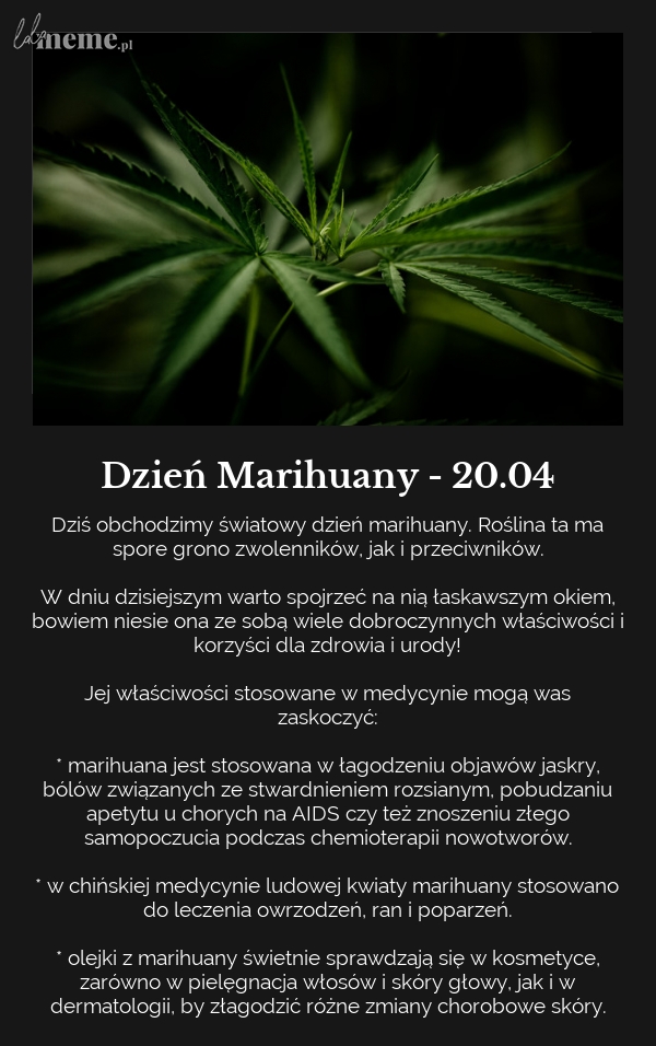 Trawka, zioło, gandzia, maryśka… Tak naprawdę palona jest na całym świecie, bez względu na to, czy jest legalna czy nie. Dlaczego akurat dzisiaj jest jej dzień? Chodzi o skrót „420”. Dziś o godzinie 16:20 entuzjaści trawki pewnie zapalili jointa. „Legenda” sięga lat 70tych i mówi o trójce uczniów, którzy po lekcjach chodzili na blanta. Przyjaciele spotykali się przy pomniku Louisa Pasteura, czyli „Louim”. Skrzykiwali się hasłem „four-twenty Louie”. Stąd wzięło się popularne wśród palaczy trawki 420 odwołujące się do 4:20 po południu. A 20 kwietnia, to data 20.04, czyli godzina spotkania w przestawionym szyku 🙂