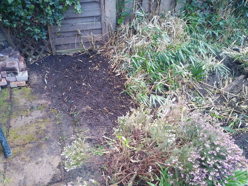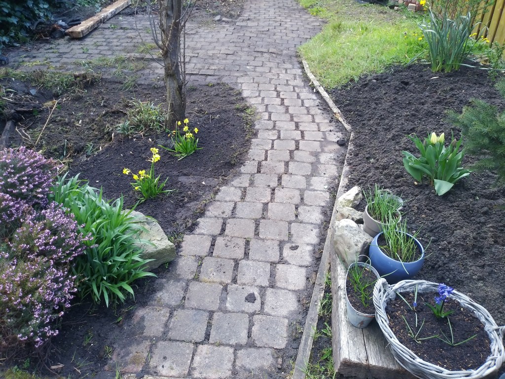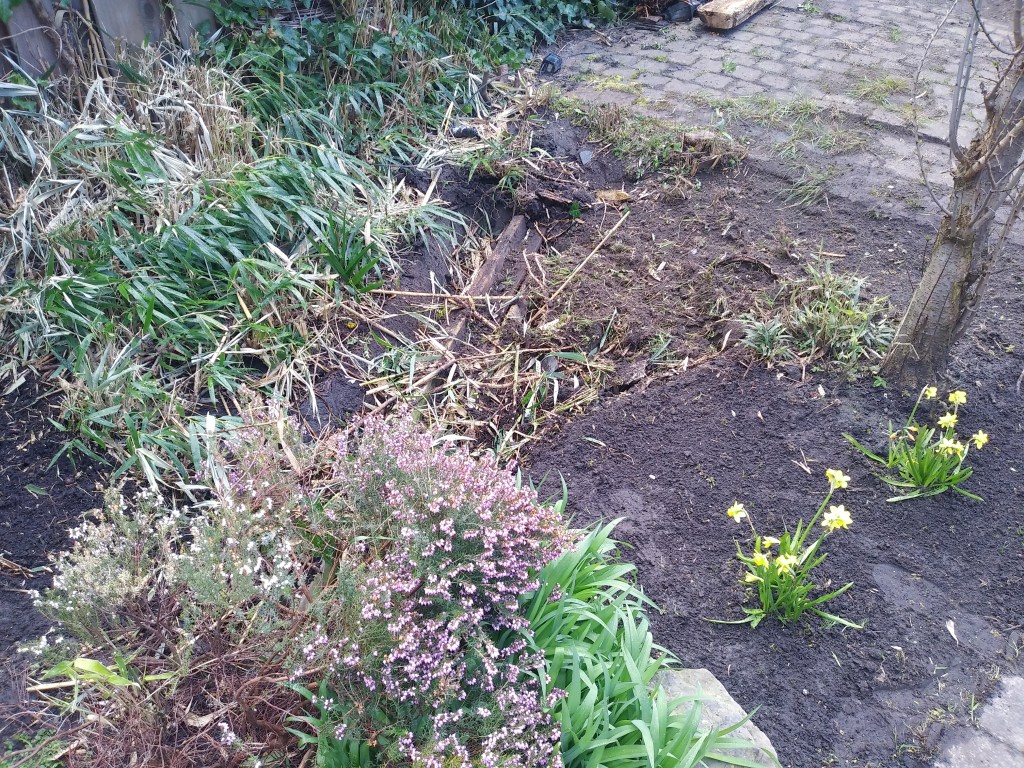 Między kostką brukową powyrywałam chwasty i zrobiło się czyściej 🙂 Pan Mąż wyciął część bambusa. Trzeba będzie wyciąć go totalnie, bo inaczej z trawy nic nie będzie, a chcemy przecież trawnik mieć. Wszystkie liście, chwasty, patyki i deski wylądowały w dole po oczku wodnym. Jest niemal pełny, więc dużo ziemi nie będzie potrzeba, żeby całkiem je zakopać.