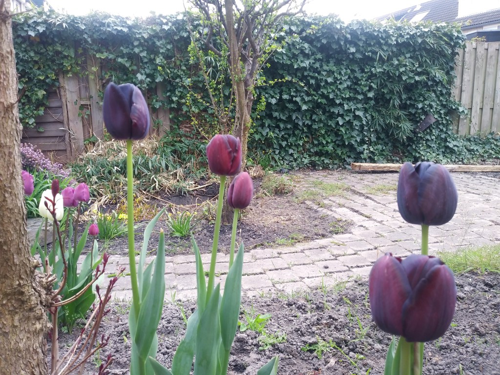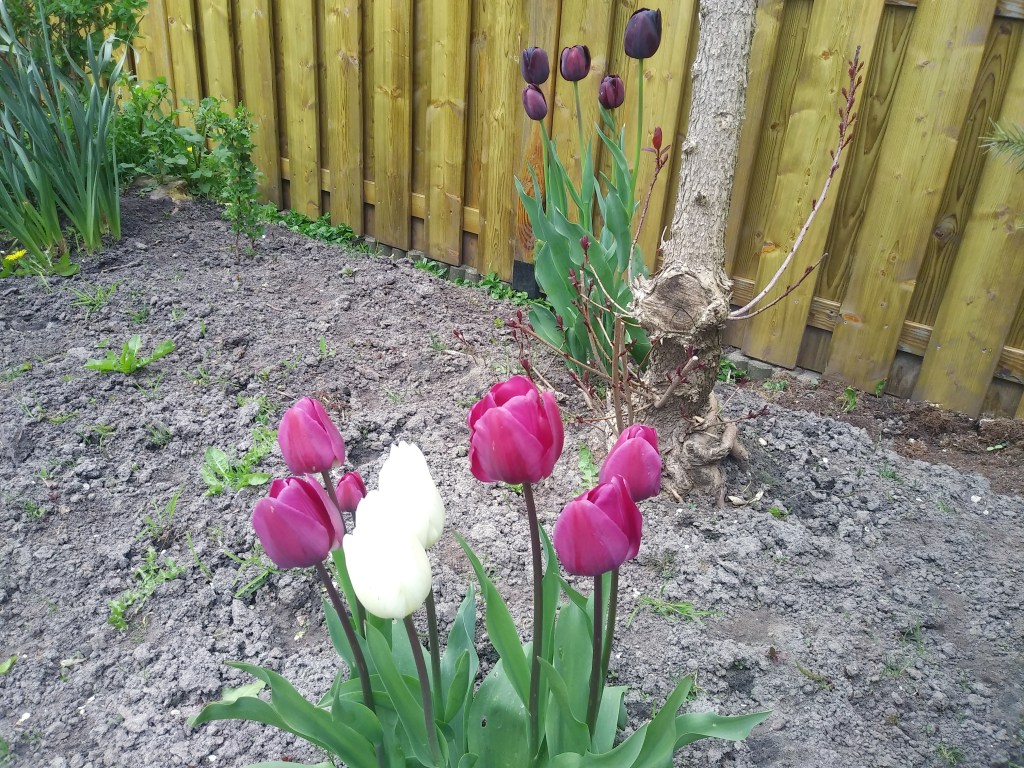 W ogródku za dużo nie zrobiliśmy. Żonkile przekwitły a za to wybiły tulipany. Oprócz tego wzeszły słoneczniki 🌻 które posadziłam pod płotem. Wyrzucałam tam starą ziemię doniczkowa a potem posiałam nasiona. I są to te małe słoneczniki, które ucina się potem do wazonu.