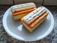 Tradycyjnie je się też specjalne ciastko, które funkcjonuje jako królewski wypiek- Koningsgebak od 27 kwietnia 1967r, czyli od narodzin obecnego króla. To ciastko, to tompouce (albo tompoes). Jest podłużne, można powiedzieć, że w kształcie cegły. Składa się z dwóch warstw chrupiącgo ciasta francuskiego, przełożone one są śmietankowym kremem. Wierzch wypieku jest oblana pomarańczowym lukrem. Często jest udekorowane bitą śmietaną. W wielu innych europejskich krajach znane są desery mniej lub bardziej zbliżone do tompoes, np napoleonka (Polska), millefeuille (Francja), Napoleon cake (Wielka Brytania), foglie (Włochy), napoleonbakelse (Szwecja). Mnie tompouce kojarzy się z polskim ciastem karpatka. Ale jest słodsze od karpatki i jeśli ktoś nie przepada za słodyczami, to może się przeslodzić 😖 🍰🍰