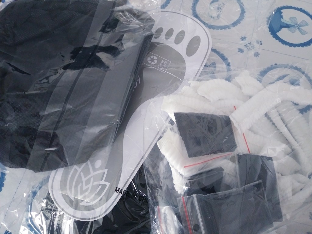 Wyszło ciut nierówno, ale to moje nogi, więc nie ma problemu. Mam rajstopy w sprayu, więc wyrównam kolor 😛 A jestem w stanie wypróbować na sobie wszystkie odcienie 😅 A co wchodzi w skład zestawu? Mnóstwo rzeczy: