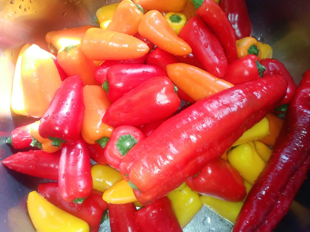 Znajoma ma znajomą, która pracuje na papryce. I dostała torbę papryk pomarańczowych, czerwonych i żółtych. Podzieliła się ze mną. Dostałam ich mnóstwo i dałam też sąsiadom. A ja jem je na surowo. Lubię, szczególnie te czerwone. Smakują jak jabłka- połączenie koszteli z papierówkami 🙂 Albo moje kubki smakowe są dziwne… 😅 Mogłabym je wsadzić do słoików, ale problem w tym, że ich nie posiadam. Wszystkie wyrzucam.