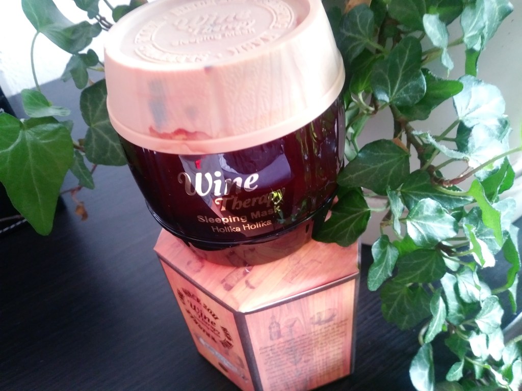 Jeśli chodzi o maski, to wypatrzyłam taką specjalną na noc🌙 Marki Holika Holika i nasycona jest ekstraktem z czerwonego wina 🍷 Ma konsystencję galaretki i działa przeciwstarzeniowo. Nakłada się na twarz, nie zmywa i idzie w kimono 😛 Używałam już podobną, nawilżającą, kupioną kiedyś w TkMax. I byłam zadowolona. Teraz czas na tą. Ma kształt beczułki wina i dołączona jest też szpatułka.