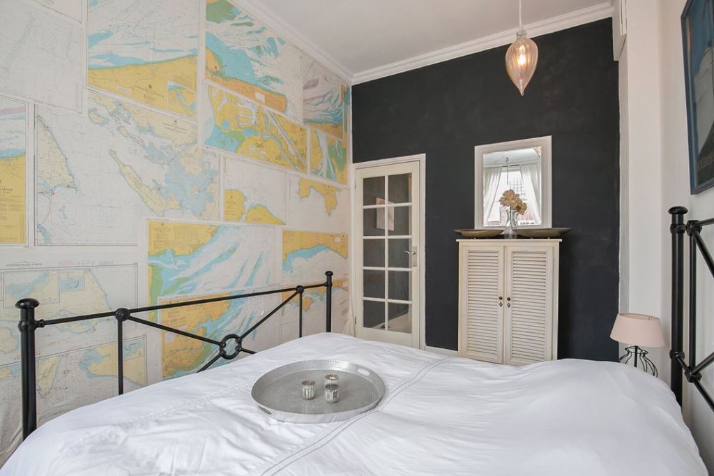 Szafka w sypialni z drzwiczkami- shutterami 🙂 Według mnie, jedne z ładniejszych mebli. Nawet biały kolor mnie nie odstrasza, a wiele takich mebli ma drzwi w kolorze drewna. Warto zwrócić uwagę na ścianę wyklejoną mapami 🙂 Nie wiem czy to taka tapeta, czy ktoś sam kombinował, ale pomysł ciekawy. Zresztą różne mapy na ścianach, to normalny widok w tutejszych domach.