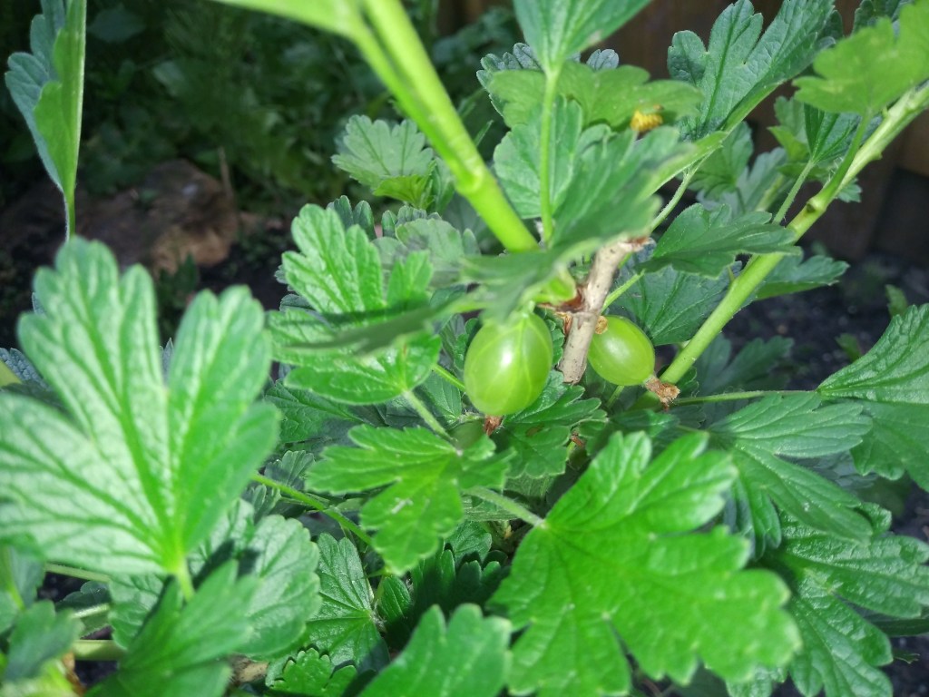 Na podwórku rośnie niewielki krzew. Liście ma podobne do jaśminu. Chciałam mieć jaśmin. I teraz zastanawiam się, czy to on, czy nie on. Czytałam, że kwitnie w maju, najpóźniej w czerwcu. Ten długo nie miał pączków, ale teraz pojawiły się malutkie 🙂 Agrest daje radę. Ma już kilka małych owoców 😊 Nazwałam go Jacuś 😂