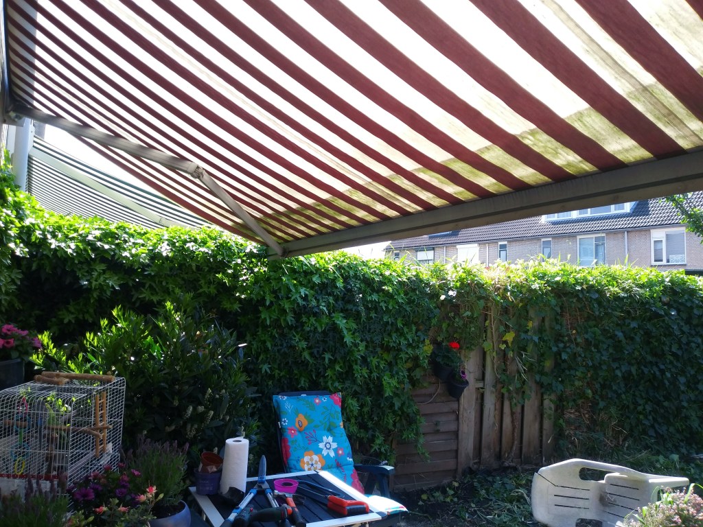 Pan Mąż kupił w markecie budowlanym rurkę, którą tak wygiął, żeby można ją było użyć jako korbę do wysuwania markizy. Mamy ją, ale korby brak. Jak już kiedyś wspomniałam, wcześniej, w naszym domu 🏠 mieszkali inni Polacy. Z tego, co wiemy, to wysuwali markize i już im się nie chciało chować. Wiatry i deszcze robiły swoje. Sąsiedzi zgłosili do biura pośrednictwa pracy i biuro zabrało specjalny „hak” do obsługi. Sąsiad zaoferował się pożyczeniem „wajchy”, ale mój sprytny mąż poradził sobie i zrobił specjalny uchwyt 😊 Markiza działa, wymaga regulacji i czyszczenia, ale jest 🎉