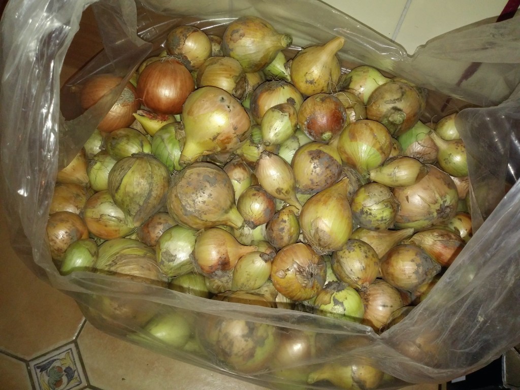Pisałam wcześniej, że sąsiadka w zamian za śliwki dała mi skrzynkę cebuli. To jeszcze „pikuś”. Pewnego dnia, sąsiad najwyraźniej na nas czekał, bo po wyjściu z auta, zobaczyłam, że leci do nas z wielką foliową torbą. Patrzę i myślę: kurczę, fajnie, bo niesie jabłka 🍏🍎 A tu guzik! Jeszcze więcej cebuli 😂 Mąż był chwilę u sąsiadów i pokazali mu, że na podwórku mają jej jeszcze więcej 😅 No bo mają znajomych farmerów od tego warzywa, dostają go sporo i się dzielą: