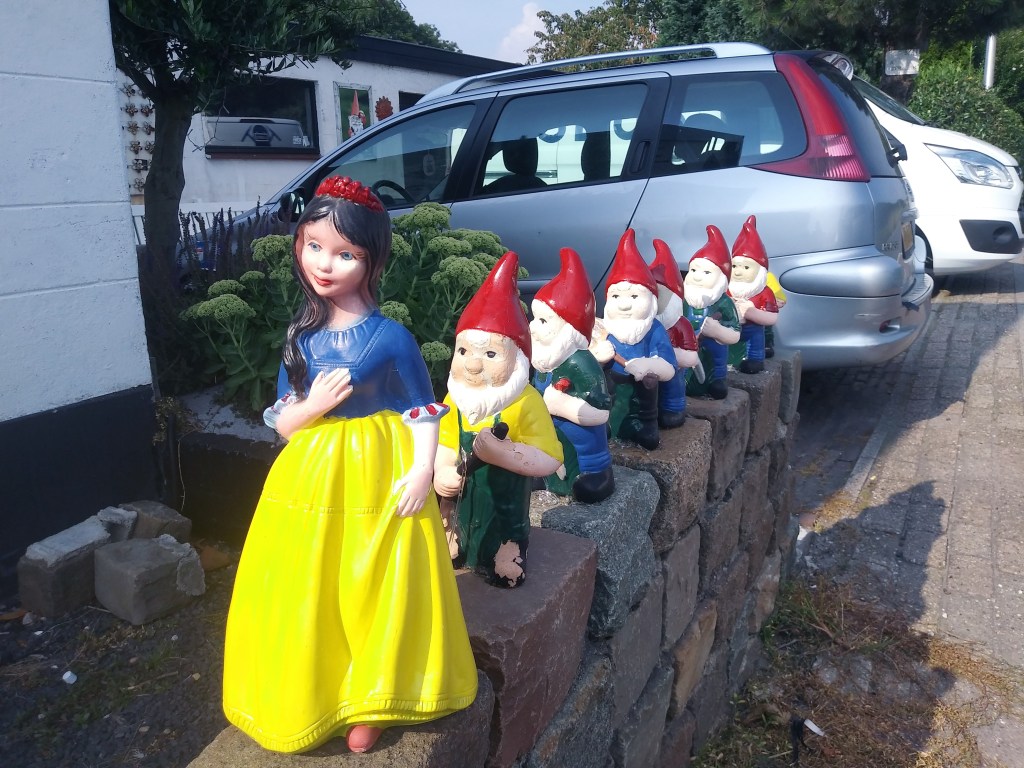 Pewnego dnia, wracając z pracy, zauważyłam ciekawą ozdobę, którą ktoś sobie przymocował do murku przed domem. Już się przyzwyczaiłam do tego, że Holendrzy mają mnóstwo różnych i czasem dziwnych ozdób ogrodowych. Ale takiej bajki się nie spodziewałam 😊 Królewna Śnieżka i 7 krasnoludków: