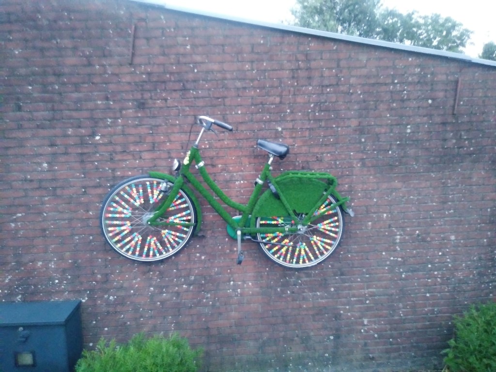 Widziałam też ozdobę rowerową 🚲 Wisiała na murze. Był to rower, który ozdobiony był koralikami na szprychach i zieloną wykładziną, która imitowała mech. Wyglądało ciekawie: