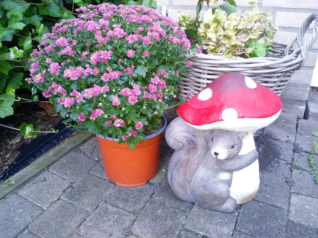 A u nas, przed domem już powoli jesiennie: postawiłam chryzantemy i figurkę wiewiórki z muchomorkiem 🍁🍂🍄 Dojdą jeszcze wrzosy i małe dynie 😊