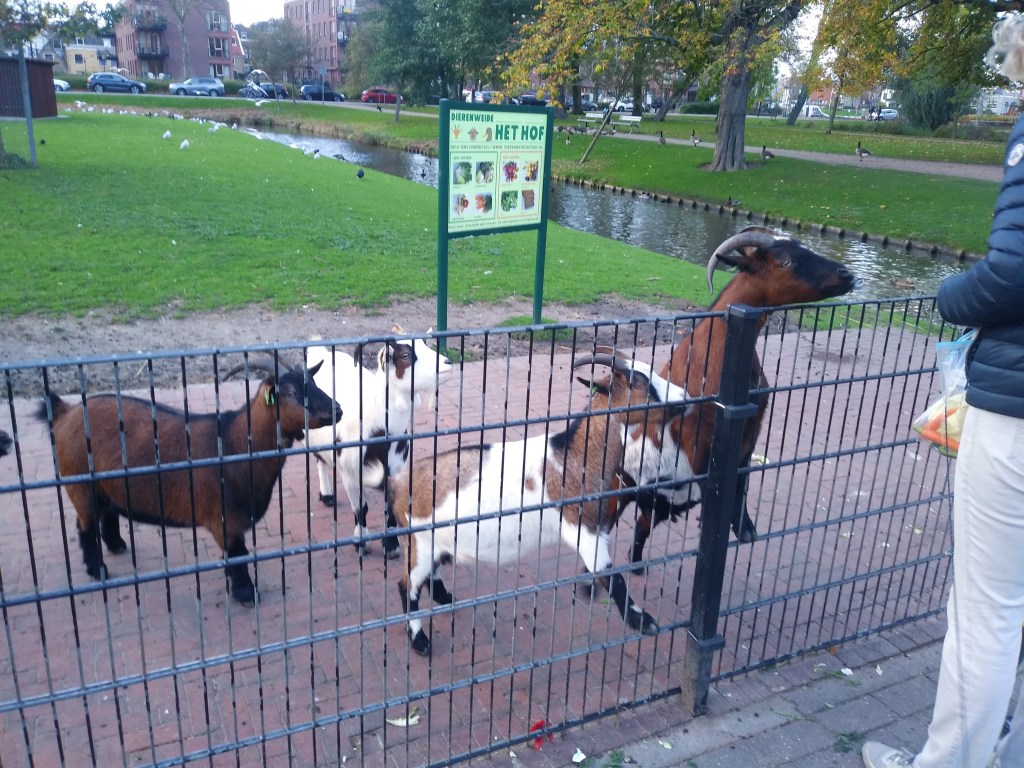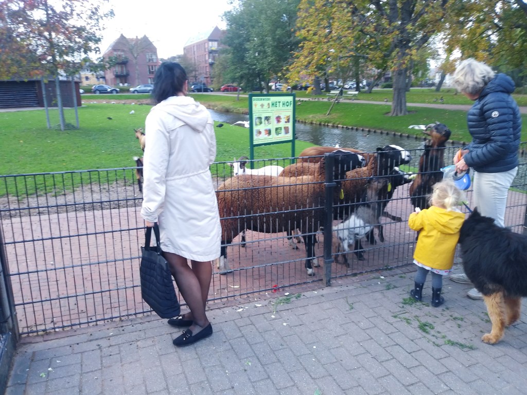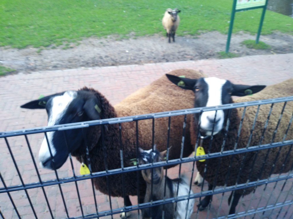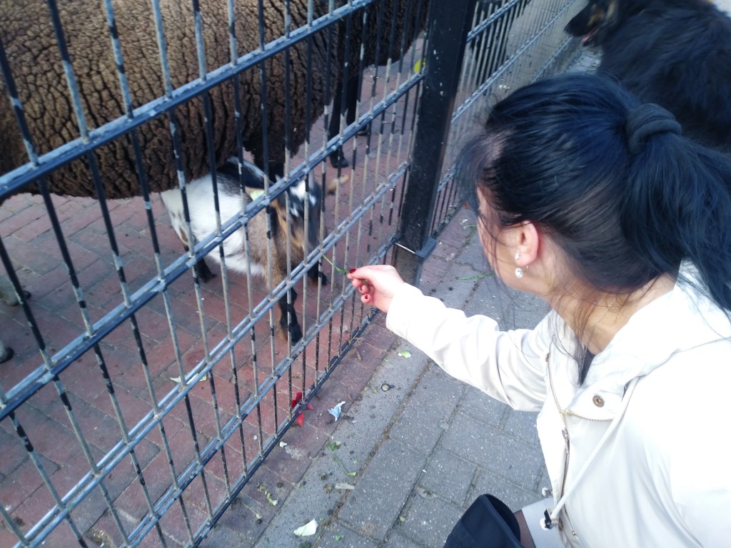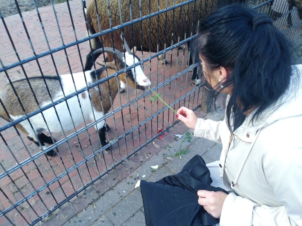 Do kina założyłam kiecke i ogólnie ubrałam się lekko. Za lekko, a było zimno. Po seansie, zamiast do domu, to poszliśmy do parku, bo było tam dużo ptactwa a w zagrodzie kozy i owce (chyba czarnogłówki się nazywają). Daliśmy im trochę natki marchewki. No i zrobiliśmy zdjęcia: