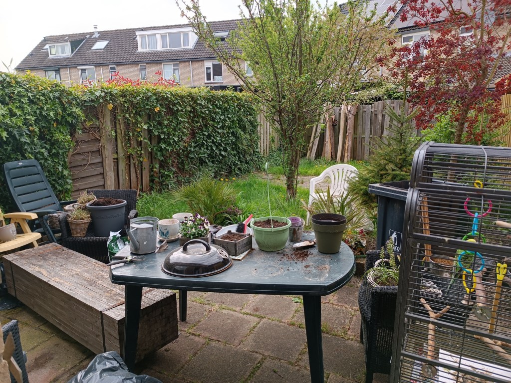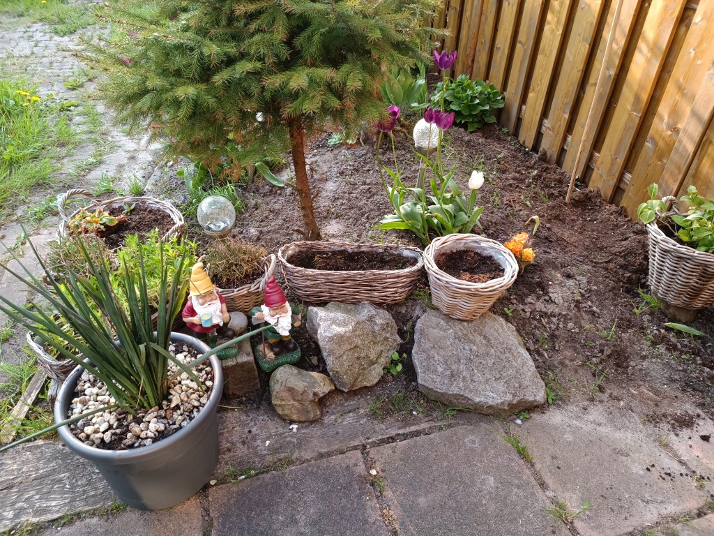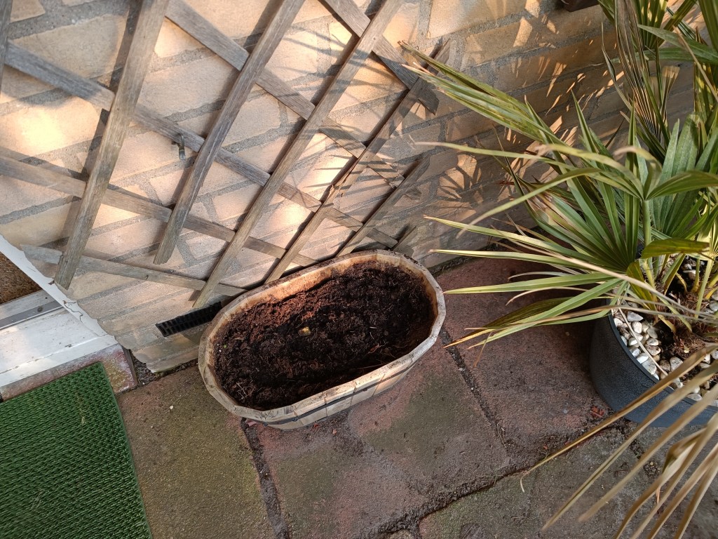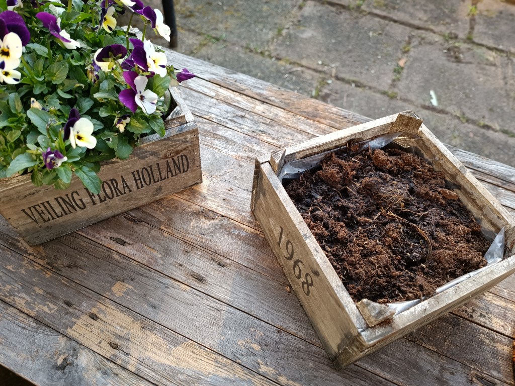 Do drewnianej skrzyneczki poszły nasiona bratków, które będą stały na drewnianej ławie (swoją drogą, wymaga ona renowacji, bo się przez zimę ciut zniszczyła). Przez zimę padła mi także roślina pienna. Wyrwałam suche badyle i wsiałam mieszankę różnych kwiatów. Niektóre będą się pięły do dwóch metrów 😁