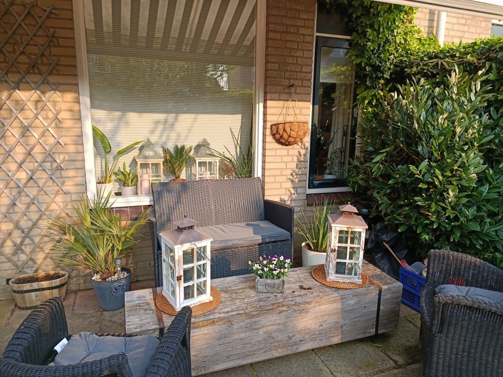 Piękny kącik. Też myślimy o markizie, ale dopiero jak nowe okna nam zamontują. Właśnie tak, aby sobie usiąść i popatrzeć na ogródek czy poczytać to bosko. Pięknie u Was ten kącik wygląda. Tulipan od koleżanki taki podobny chyba do tej hybrydy co Ci się podobała w moim blogu. Równie niski i obficie kwitnący. Może podobna odmiana?