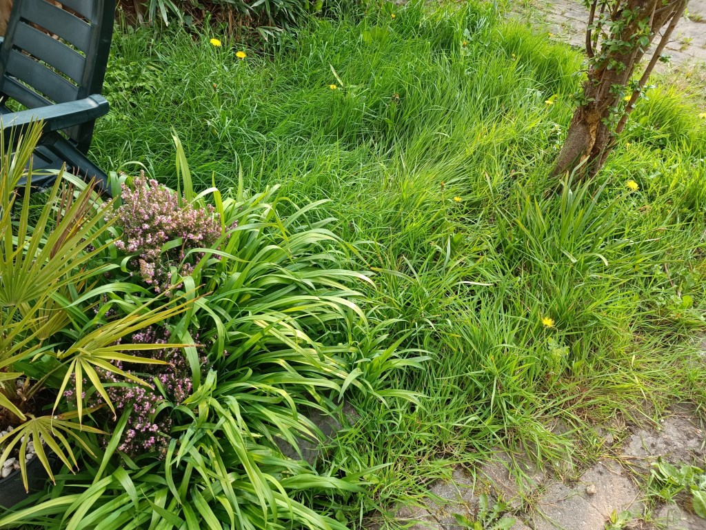 Wyrzuciłam stare, zepsute doniczki, usunęłam chwasty z płyt chodnikowych i najważniejsze: wyrzuciłam ten ohydny plastikowy stół i dwa zniszczone krzesła. Tzn wyniosłam to na drugi koniec podwórka. Jaśmin zasłania, więc mnie w oczy nie kłuje. Pan Mąż się tego musi pozbyć. No i skosić trawę, bo się mały busz zrobił. W trawie rosną mlecze, poziomki i inne takie. Wygląda to fajnie, lubię wysoką trawę, ale ogródek powinien wyglądać estetycznie.