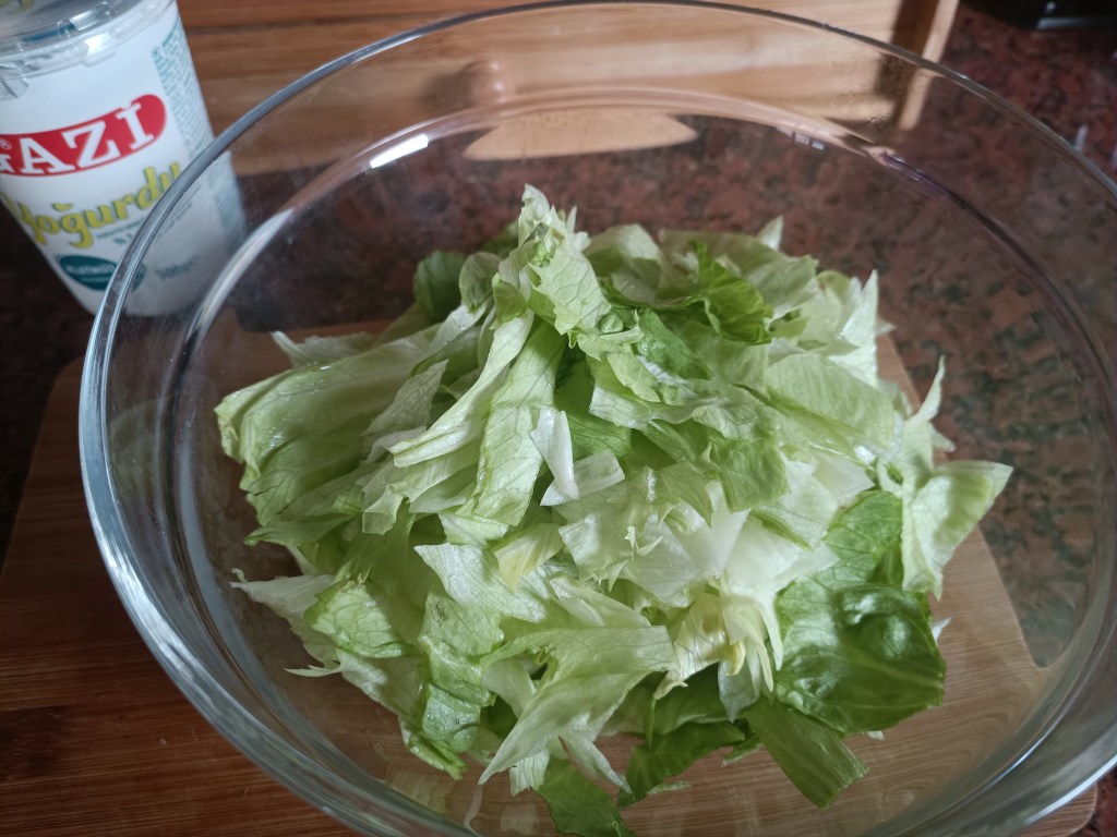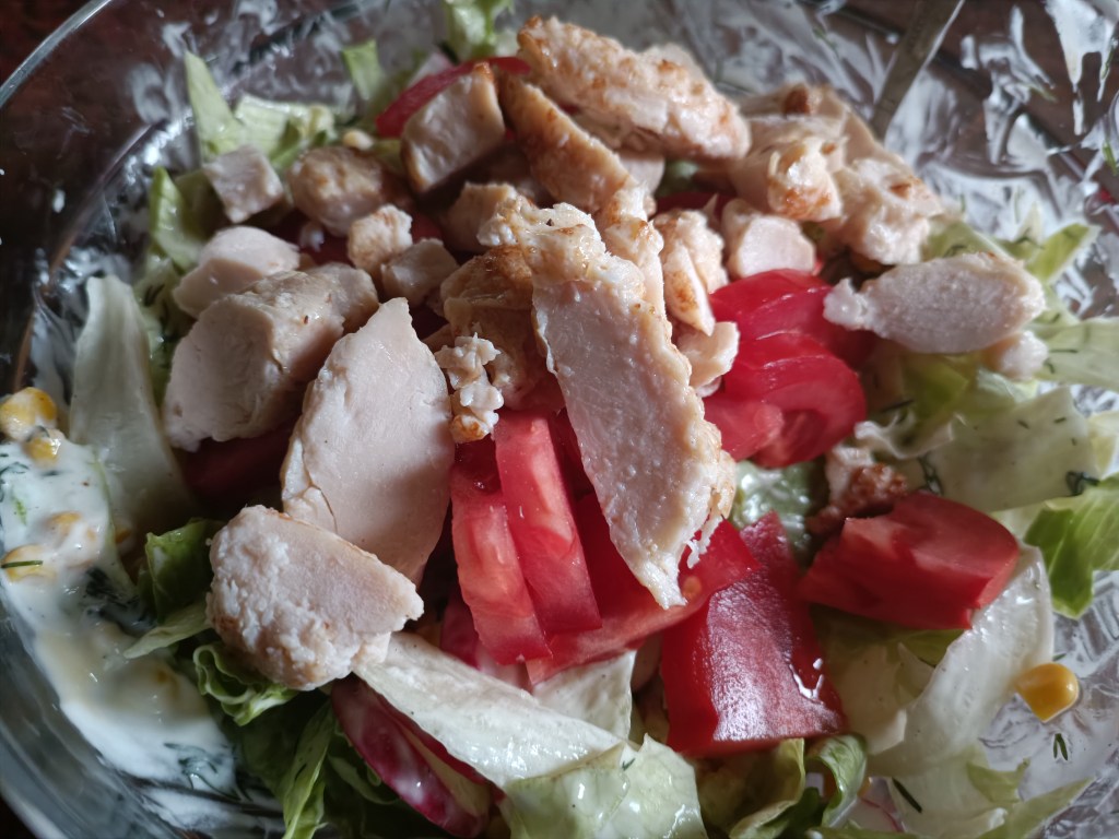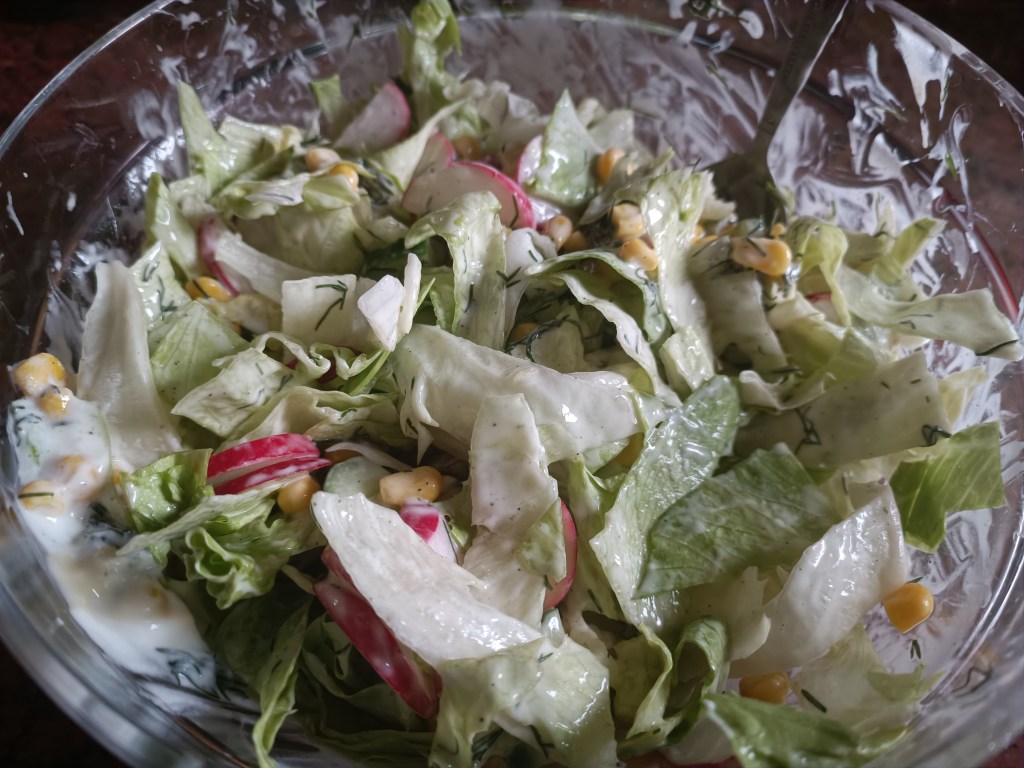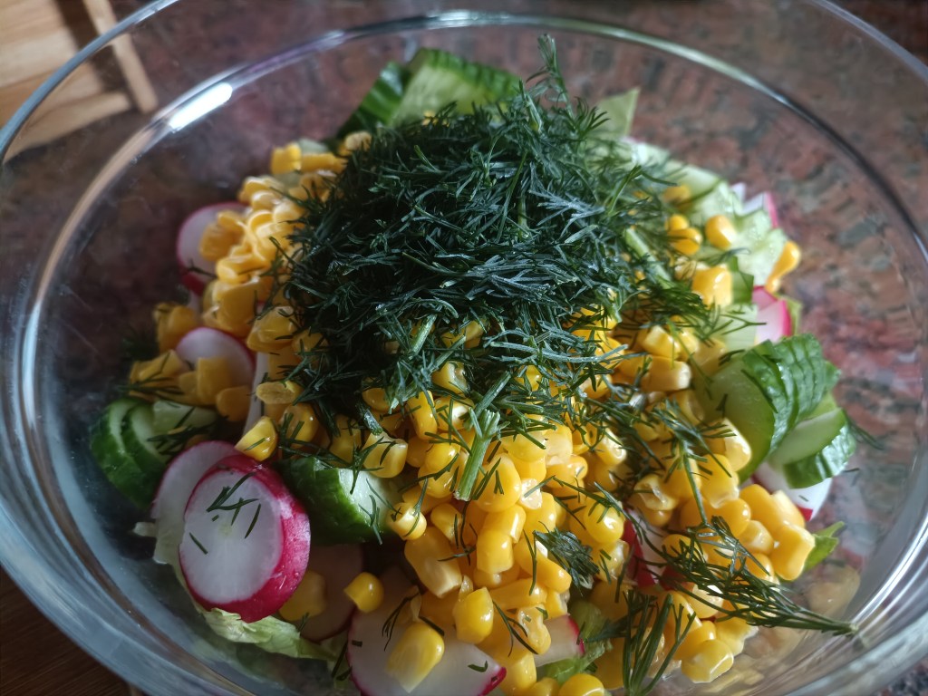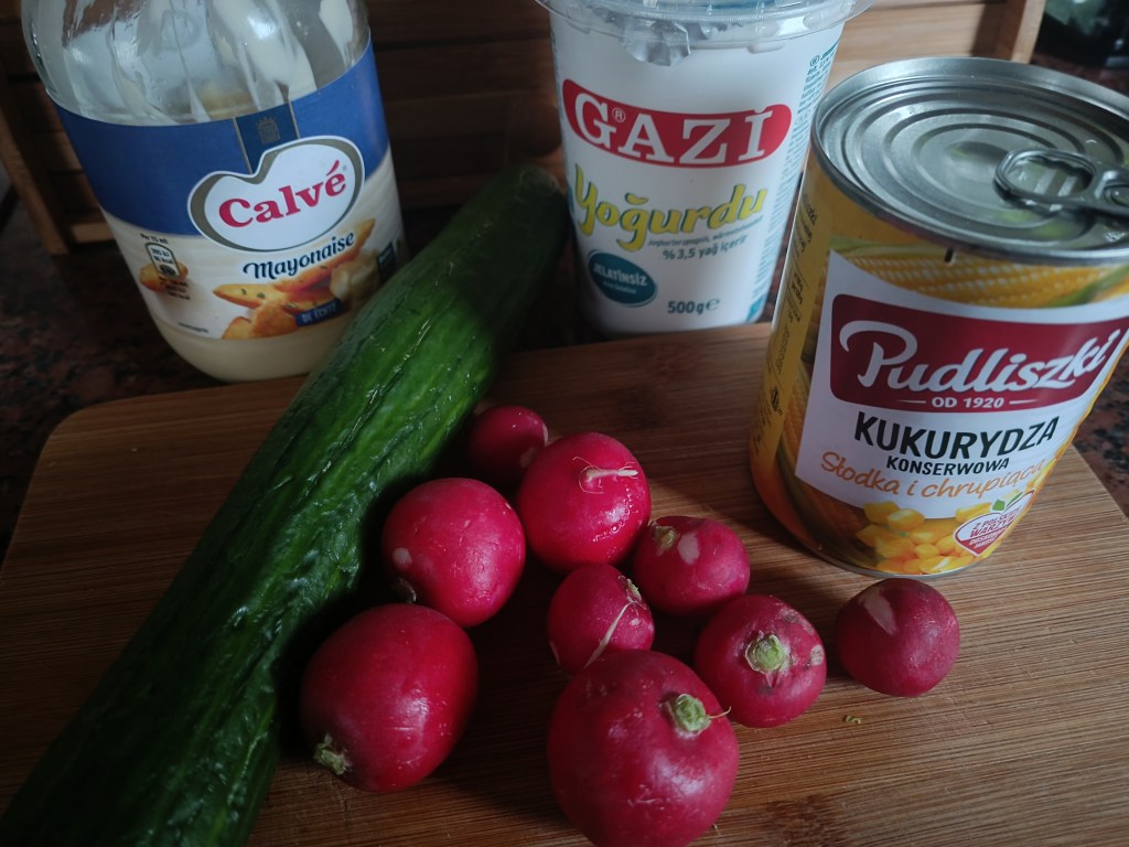 Zużyłam pół sałaty, siekając ją. Ogórka (ze skórką) i rzodkiewki pokroiłam w drobne plastry. Dodałam pół puszki kukurydzy. Dorzuciłam koperek (u mnie mrożony), dwie łyżki jogurtu, łyżkę majonezu i doprawilam.