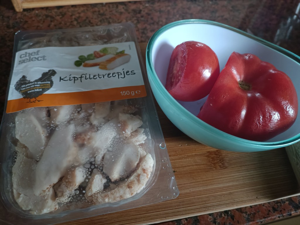 Żeby była bardziej pożywna, trochę ją zmodyfikowałam. Dodałam oczywiście pomidora i upieczony filet z kurczaka. Kupuję go w Lidlu. Jest już w kawałkach i naprawdę dobry w smaku.