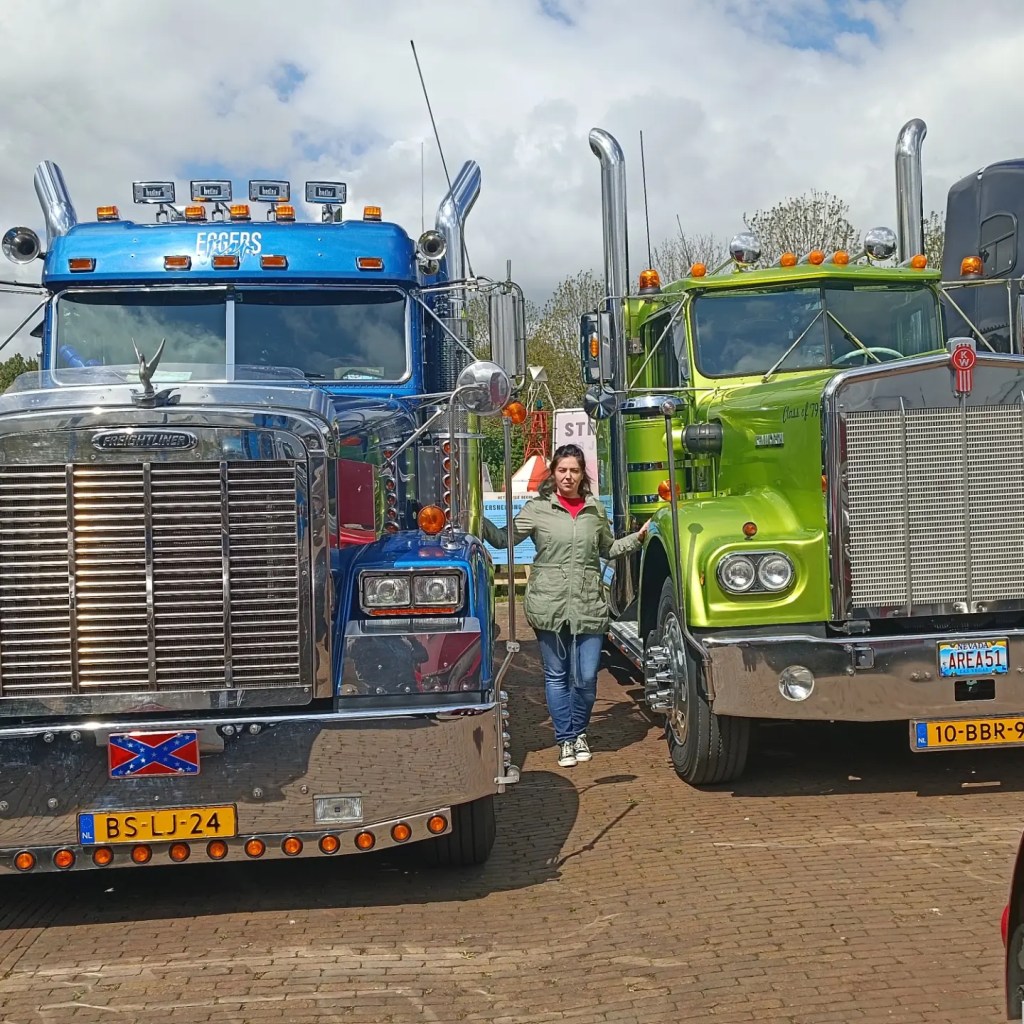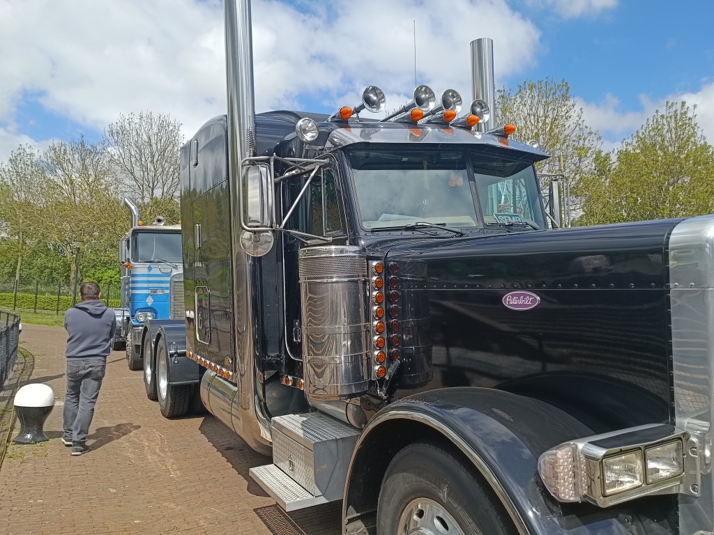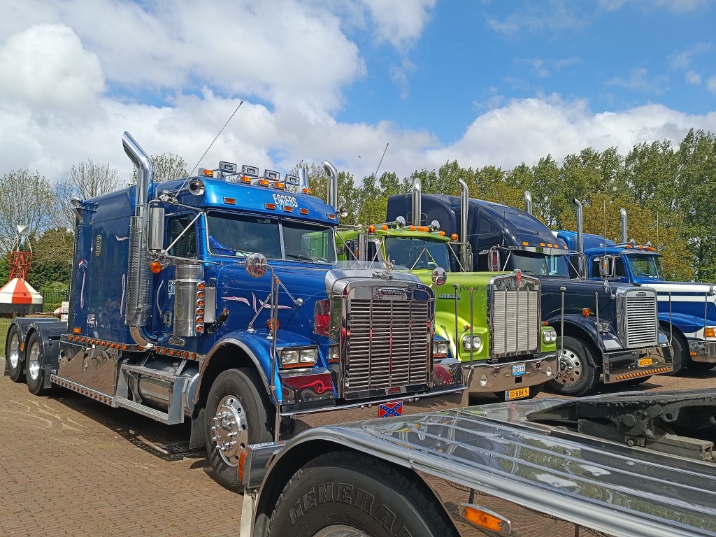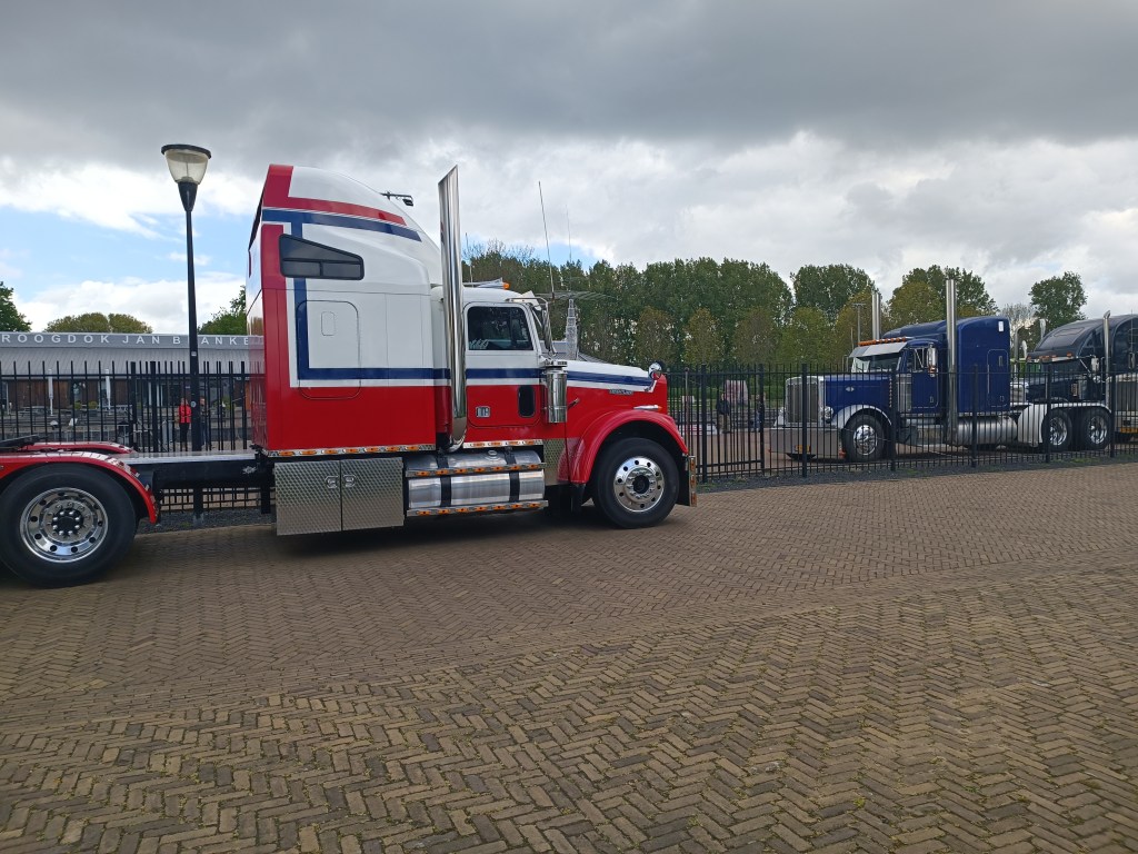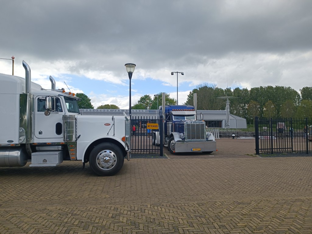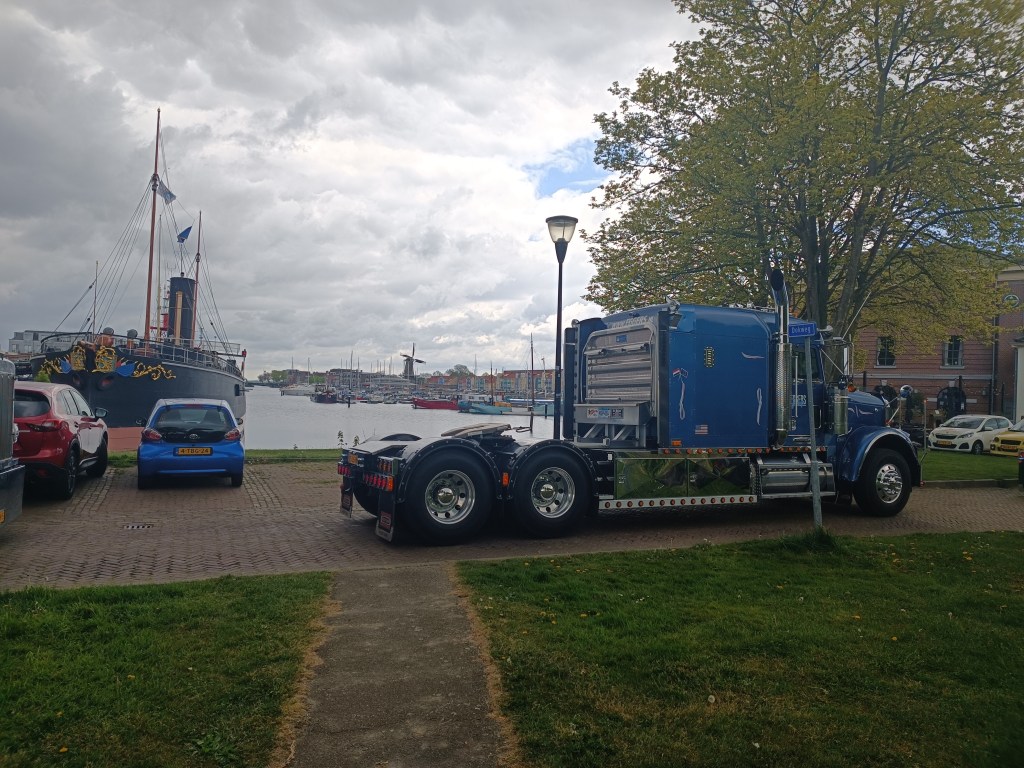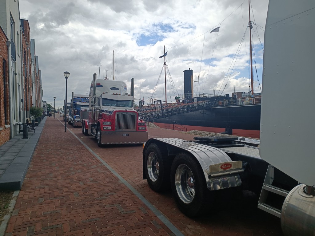 Jechały na Stare Miasto, tam gdzie port i wiatrak, czyli w część miasta, gdzie wcześniej wynajmowaliśmy mieszkanie. Pierwsza myśl: zlot. Musieliśmy to zobaczyć. Dlaczego? Bo te amerykańskie giganty zawsze robią wrażenie. Mnie zawsze kojarzą się ze świąteczną reklamą Coca-Coli. Te, co tutaj się pojawiły, były na holenderskich blachach. Każdy potworek miał swoją nazwę 😁 Tak, jak łodzie przycumowane w porcie.
