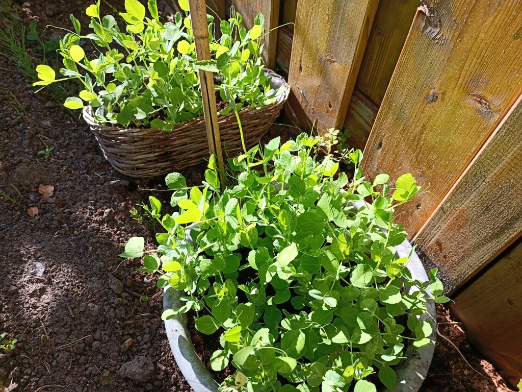 Groszek cukrowy rośnie, jak porypany. Chciałam, żeby piął się po kijkach bambusowych, ale to głupi pomysł. Tu potrzeba czegoś solidniejszego. Wymyśliłam, że w markecie budowlanym kupię metalową kratkę i wbiję w ziemię. Będzie miał dużo miejsca do wypuszczania pędów.
