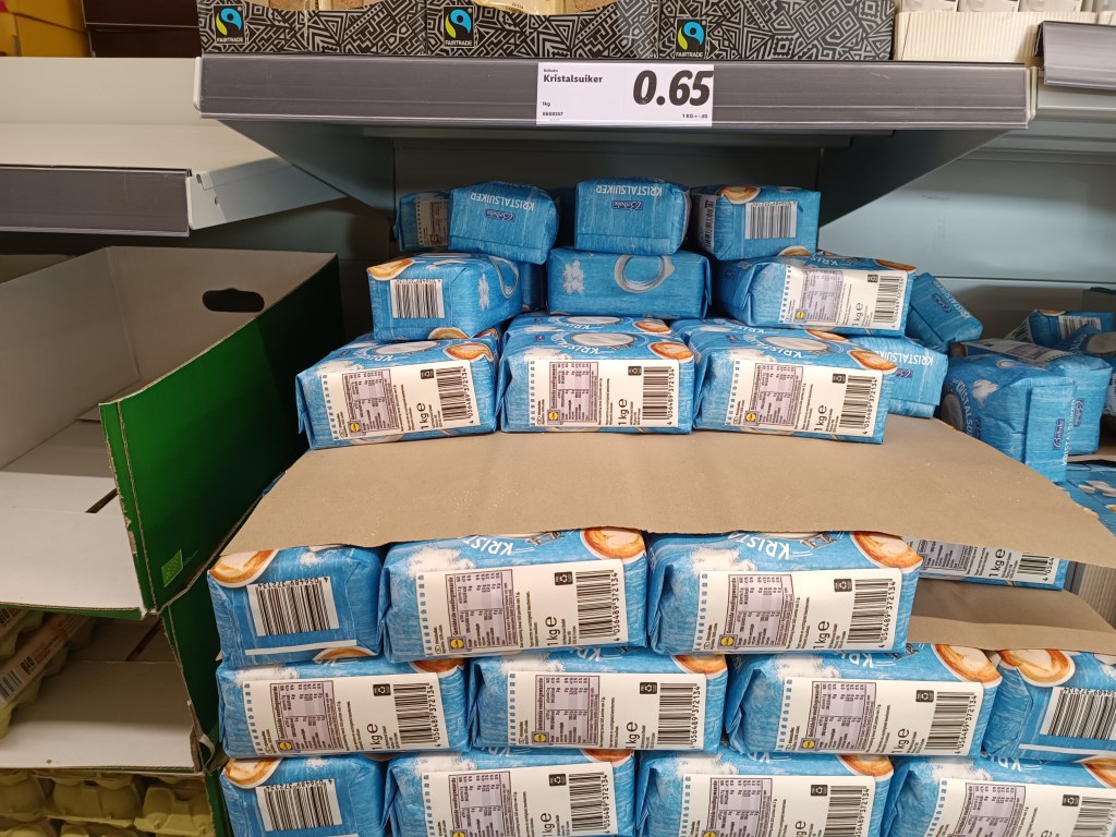 Na koniec zostawiłam produkt luksusowy, czyli cukier. Zupełnie nie rozumiem tego szału, który panuje w Polsce. Tu jakoś niczego nie brakuje. Ostatnio widziałam filmik w necie, chyba z marketu w Lublinie. Rzucili olej w niższej cenie i ludzie się niemal zabijali o niego. A że jest to mój blog, to pozwolę sobie na skomentowanie tego szału na cukier. Nam kilo cukru starcza na miesiąc, jak nie dłużej. Słodzę troszkę herbatę, kawę więcej, bo taką lubię. Jeśli ktoś potrzebuje więcej kilo, ok. Ale przecież ten cukier jest w magazynach. Chowanie go i podnoszenie ceny jest specjalną zagrywką. Jeśli chodzi o rozwój, Polska jest blisko zachodu. Jeśli chodzi o mentalność, niestety jak za komuny się niektórzy zachowują… Mojej koleżanki z pracy mama, robi mnóstwo przetworów owocowych. Potrzebuje cukru. I znaleźć go nie może, bo ludzie go kupują jak szaleni. W takim razie koleżanka ma zamiar jej przywieźć 10kg z Holandii. Koszt cukru: