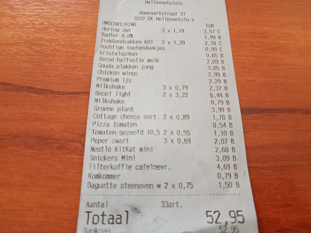 I oto nasz paragon grozy: 52,95€. Jestem bardzo ciekawa kwoty tych samych produktów, lub podobnych, w Polsce. Tu się oczywiście na złotówki nie przelicza.No i zarobki też są inne. Ale eksperyment chętnie zrobię, będąc w Polsce.