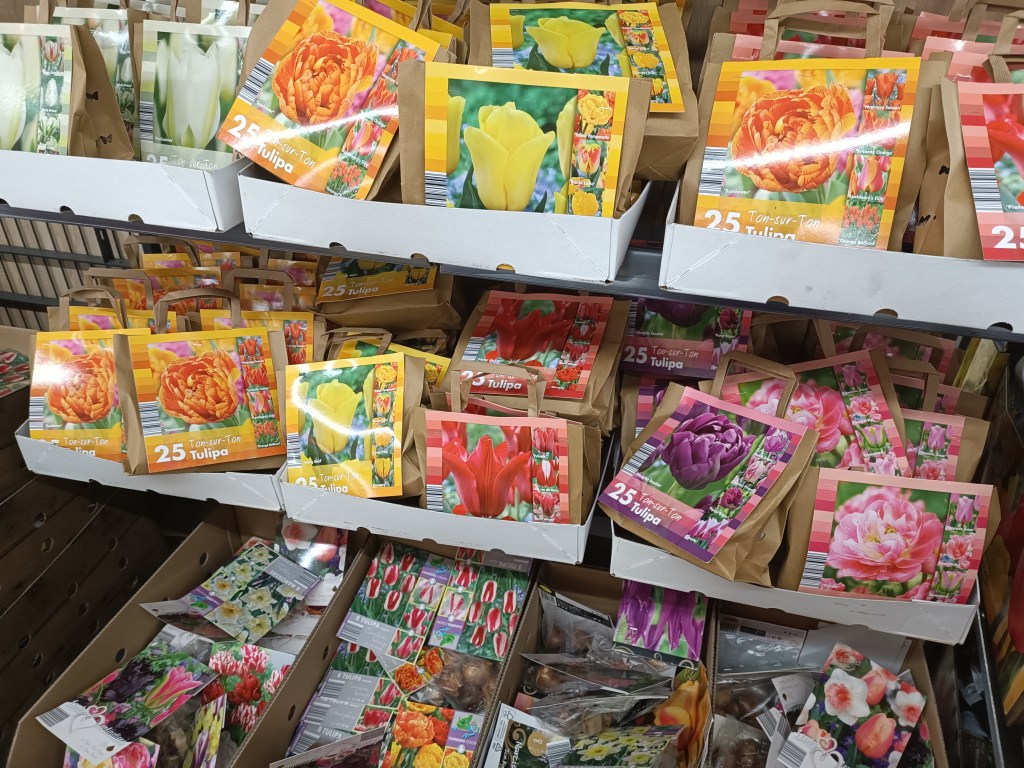 W sklepach pojawiły się cebulki tulipanów, żonkili, krokusów i innych takich, które trzeba wsadzić we wrześniu i na wiosnę zakwitną. Kupiłam tego sporo i zawiozłam do Polski w ramach prezentu. Teraz wożę dla rodziny pomidory i rośliny cebulkowe 🙂