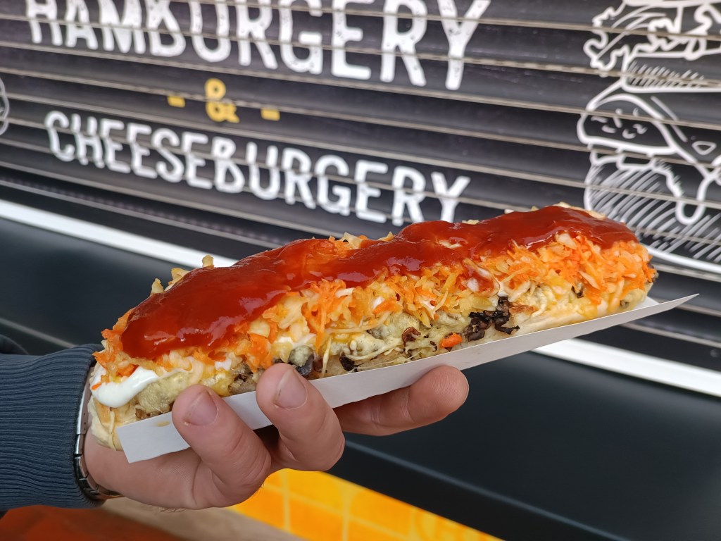 Pan Mąż skorzystał z okazji i poszedł na hod-doga a potem na polski specjał, czyli zapiekankę do ulubionej budki z fast foodem. Ja jem tam tylko frytki. Zapiekanka była w dwóch wersjach: standardowo z pieczarkami i drugi wariant z surówką, taką jaka jest zazwyczaj w hod-dogach. Samą zapiekankę lubię, z surówką nie dla mnie.