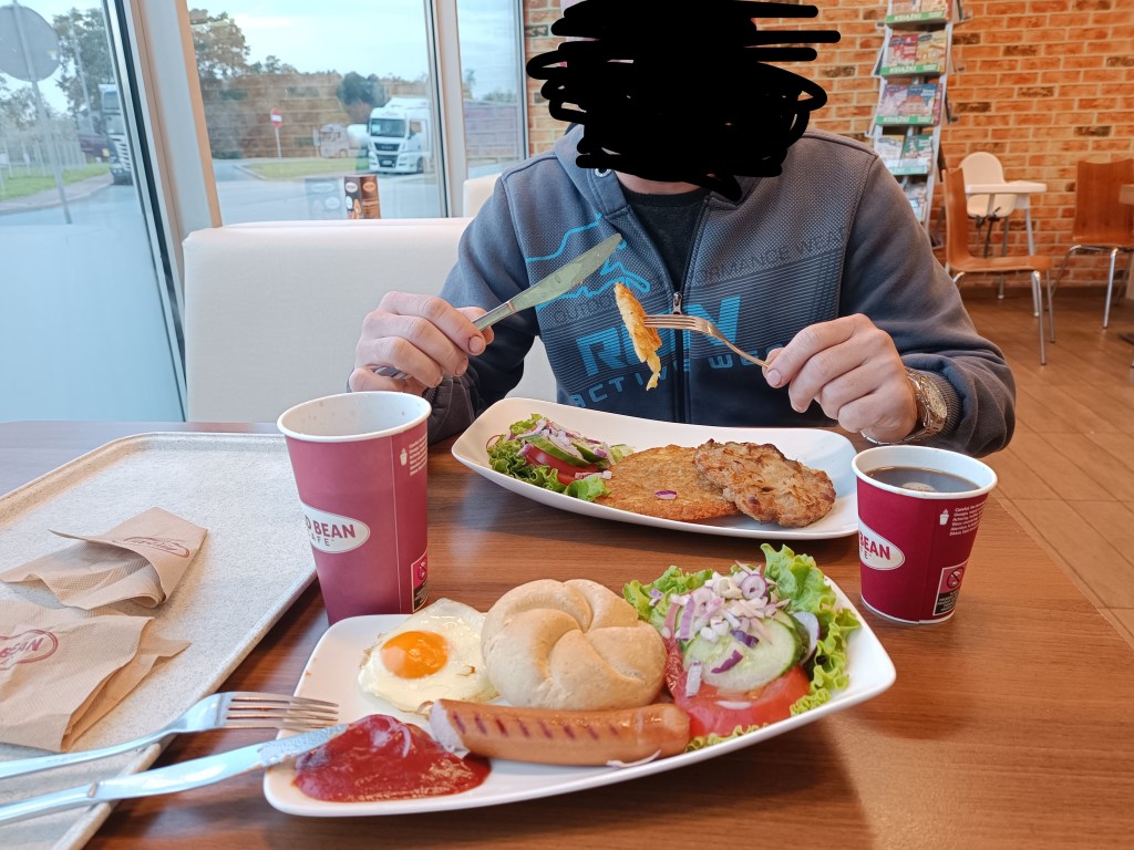 Gdy wyjeżdżaliśmy w piątek wieczorem, było ciepło i padał delikatny deszcz. Po całonocnej jeździe, na granicy zatrzymaliśmy się na kawę i śniadanie. Najbardziej smakowała mi kiełbaska:)