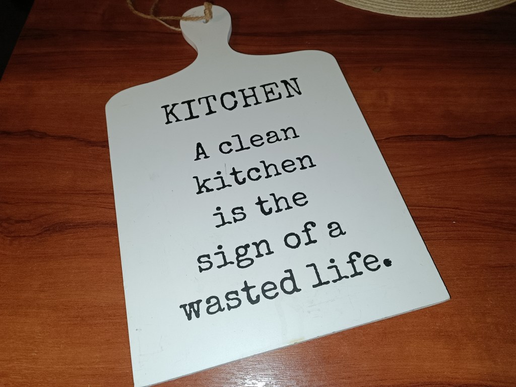 Ozdobna deska z napisem na ścianę w kuchni. Napisy naklejone bezpośrednio na ścianę, nie podobają mi się. Ale takie w ramkach, czy właśnie na deskach, owszem. Teraz wisi obok zegarka w kształcie patelni. Na kuchenną ścianę trafił też drewniany termometr przywieziony z Polski.