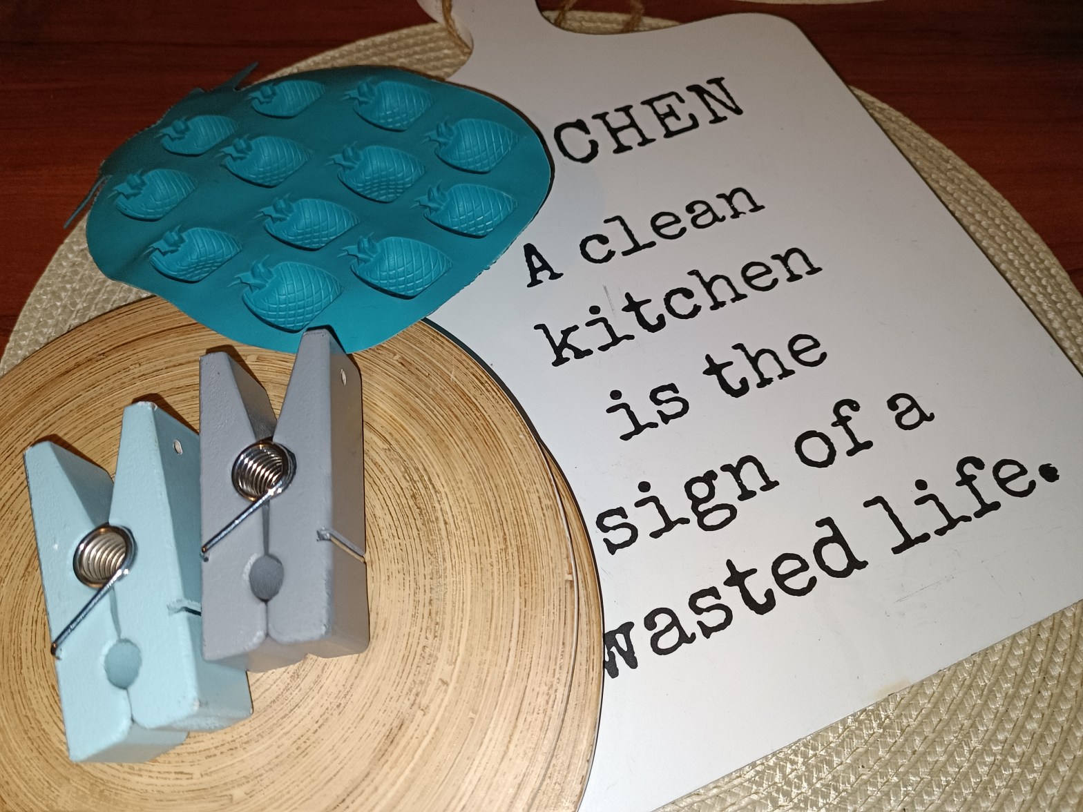 Ozdobna deska z napisem na ścianę w kuchni. Napisy naklejone bezpośrednio na ścianę, nie podobają mi się. Ale takie w ramkach, czy właśnie na deskach, owszem. Teraz wisi obok zegarka w kształcie patelni. Na kuchenną ścianę trafił też drewniany termometr przywieziony z Polski.