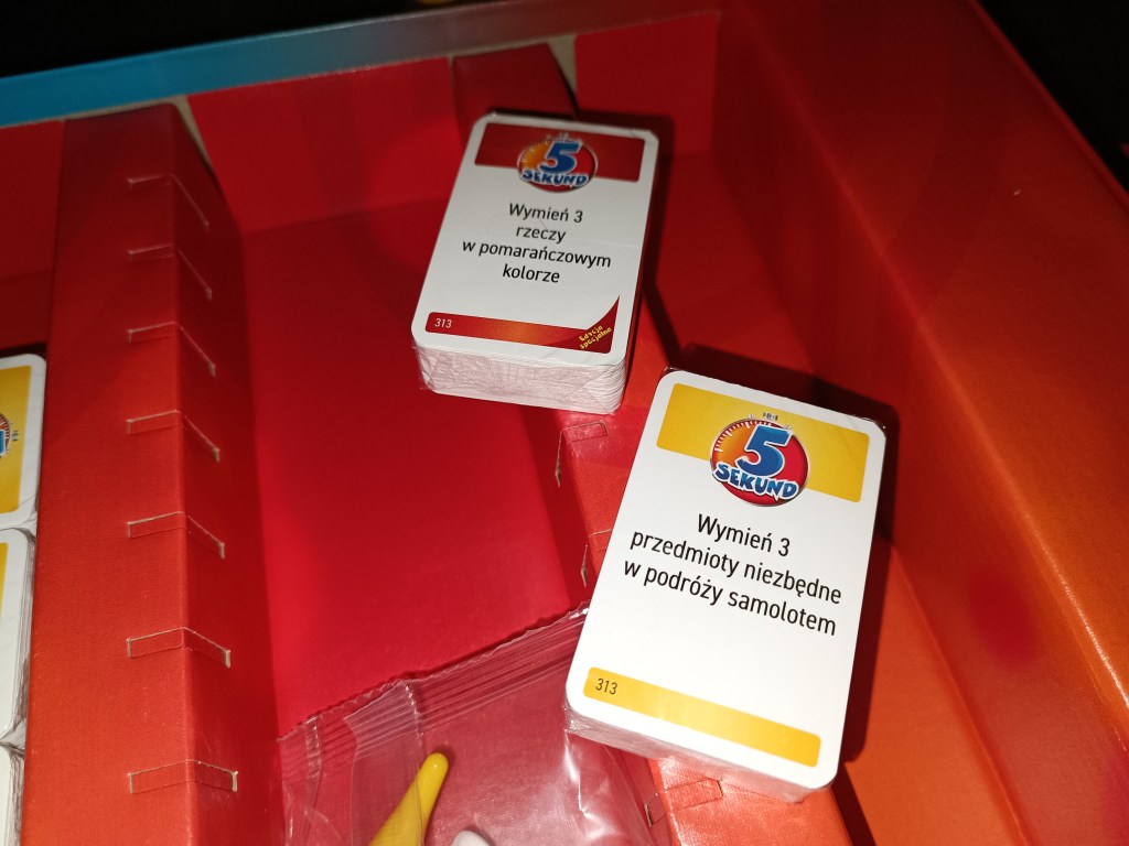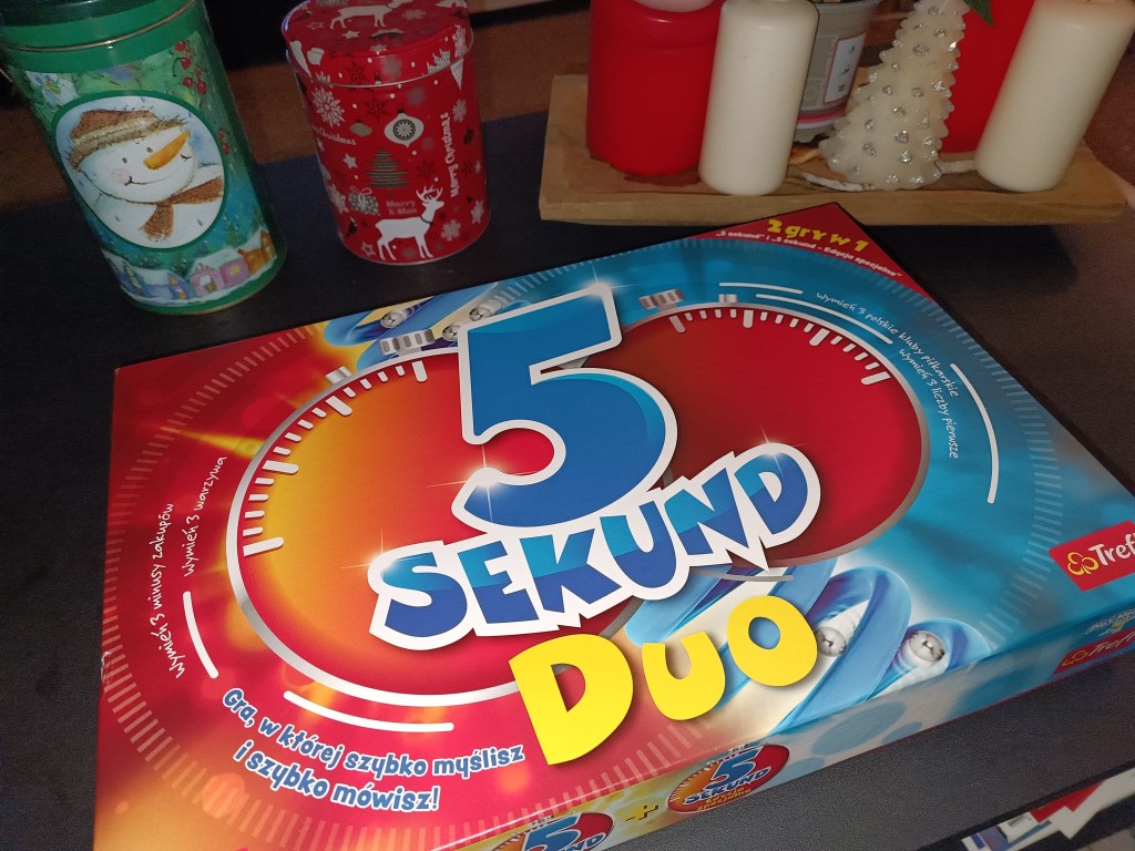 Ja zatrzymałam się przy grze „5 sekund”. Już wcześniej o niej słyszałam i to same superlatywy. Szkoda nie kupić. Mnie trafiła się wersja „5 sekund DUO”. Jest to połączenie dwóch wersji: „5 sekund” i „5 sekund- edycja specjalna”. W pudełku są aż 734 karty z 1468 pytaniami! O co w tym chodzi? Z pewnością bez trudu można wymienić np 3 razy psów. Ale czy da się radę zrobić to pod presją czasu? Czas na odpowiedź to tylko 5 sekund a pozostali gracze czekają na potknięcia. Najlepiej odpowiadać z sensem, ale ciężko to zrobić w tak krótkim czasie i często wygaduje się głupoty i pierniczy trzy po trzy. Czas odmierza specjalna spiralna „klepsydra”, która wydaje śmieszny dźwięk 🙂