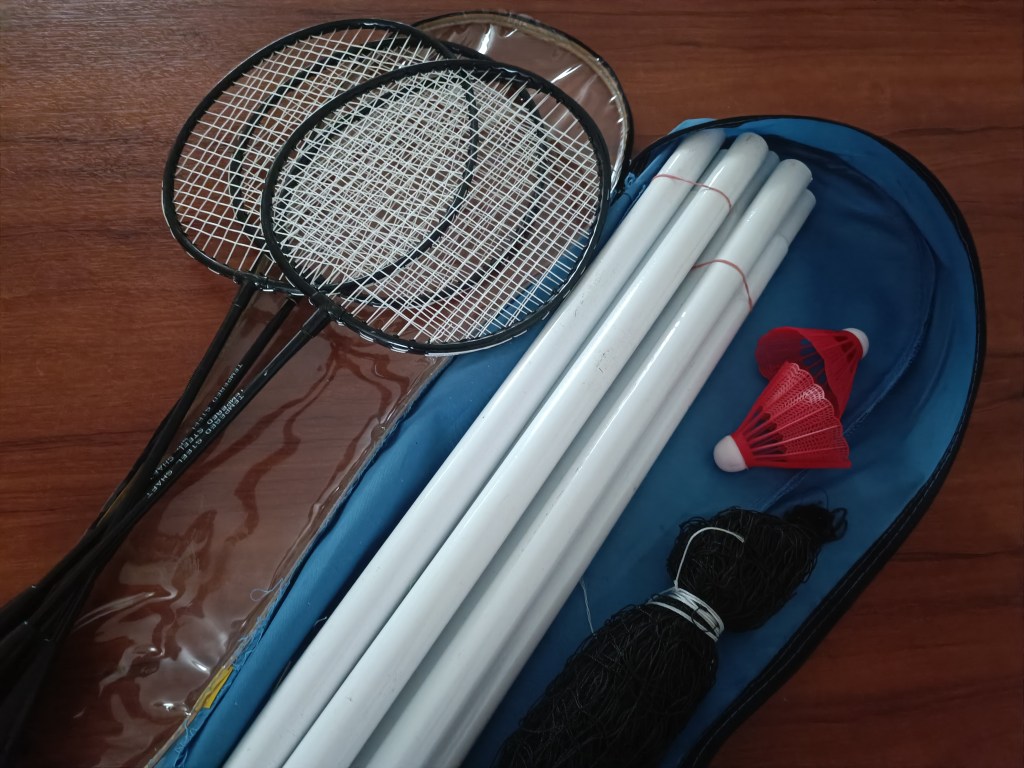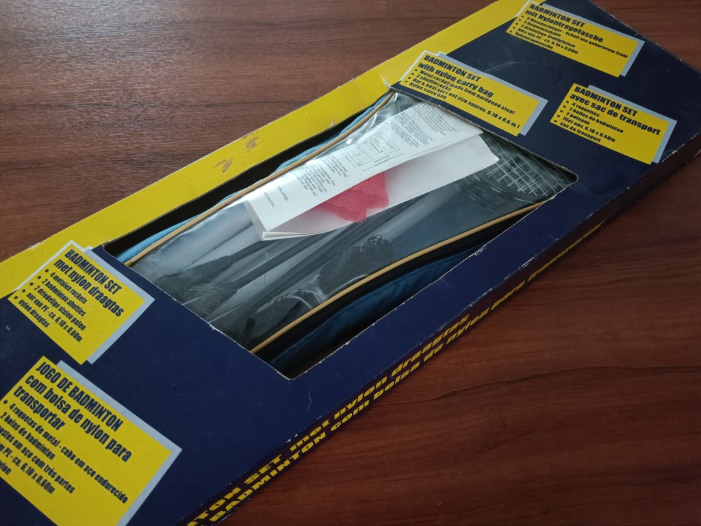 Komplet, który my zdobyliśmy znajduje się w niezniszczonym etui. W środku są cztery rakietki, dwie lotki, słupki i siatka.