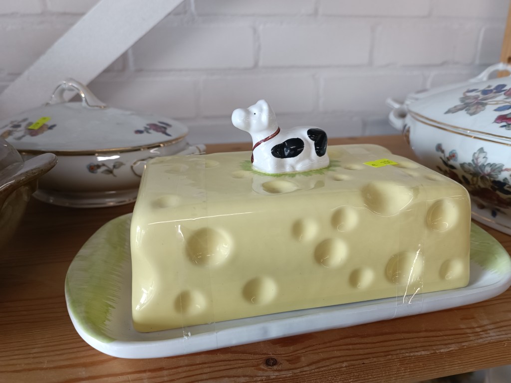 Widziałam też ciekawe naczynie na ser żółty. Na początku myślałam, że to maselniczka, ale gdy podeszłam bliżej, to okazało się, że wieko jest w kształcie sera z dziurkami. Mnie takie coś w sumie niepotrzebne, bo kupujemy ser w plastrach lub już starty.