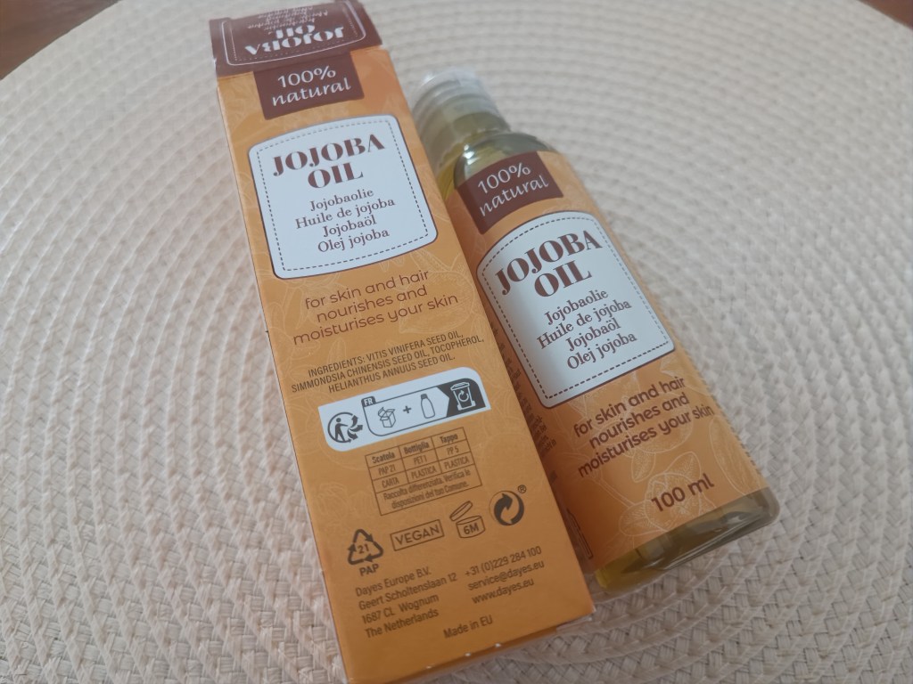 Olejek jojoba. Nadaje się do skóry i włosów. Odżywia i nawilża. Można go stosować do usuwania makijażu i jako maskę do włosów (nałożyć na włosy na 10 minut i umyć łagodnym szamponem). Ja stosuję go na końcówki, bo uparcie mi się puszą.
