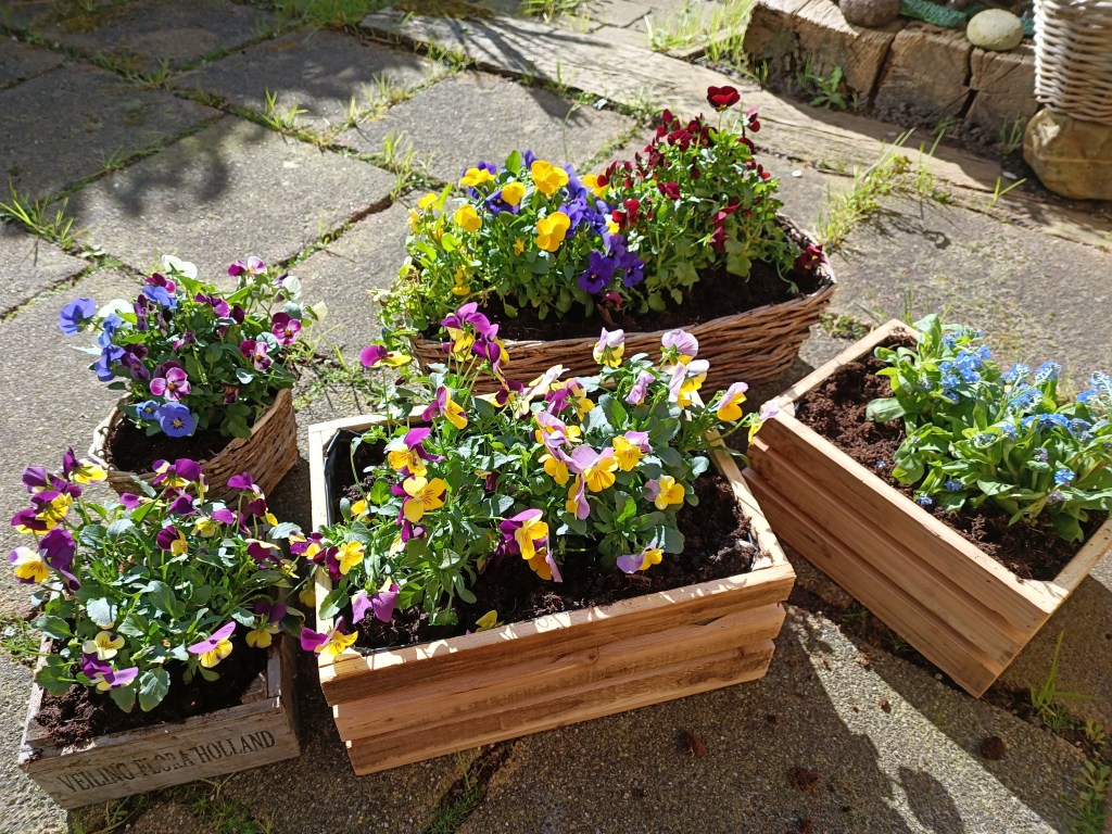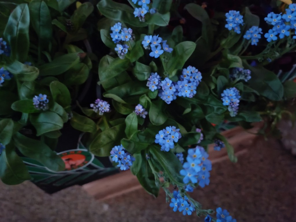 Dzisiaj pracę skończyliśmy około 12:00, więc zaplanowałam, że posadzę nowe kwiatki do doniczek. A dokładniej, do drewnianych skrzynek i koszyków z zeszłego roku. Kupiłam sześć sztuk różnokolorowych bratków za 5€ i dwie rośliny o drobnych niebieskich kwiatkach. Wydawały mi się znajome. Myślałam, że to niezapominajki i dla pewności sprawdziłam w aplikacji. Dobrze myślałam. Już zapomniałam, że takie kwiatki istnieją a są przecież naprawdę ładne.