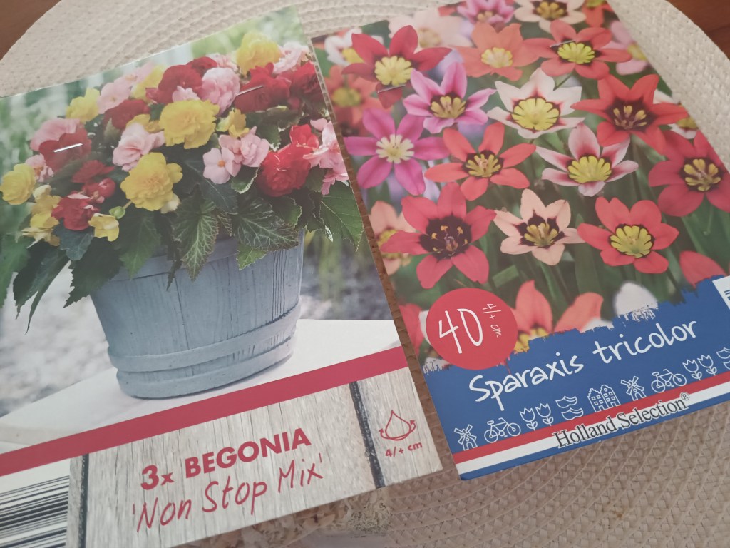 W Lidlu dotrwałam jeszcze begonię i sparaxis trójkolorowy. Begonia poszła do wiszącego koszyka a sparaxis podzieliłam na dwie części, bo sporo cebulek było. Posadziłam trochę pod płotem i trochę pod drzewem. Mam nadzieję, że coś wyrośnie, bo to ładna roślina.